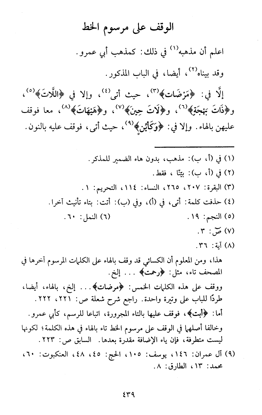 إِلَّا فِي: {مرضات} ، حَيْثُ أَتَى، وَإِلَّا فِي {اللات} ، و {ذَات بهجة} ، و {لات حِين} ، و {هَيْهَات} ، مَعًا فَوقف عَلَيْهِنَّ بِالْهَاءِ. وَإِلَّا فِي: {وكأين} ، حَيْثُ أَتَى، فَوقف عَلَيْهِ بالنُّون.