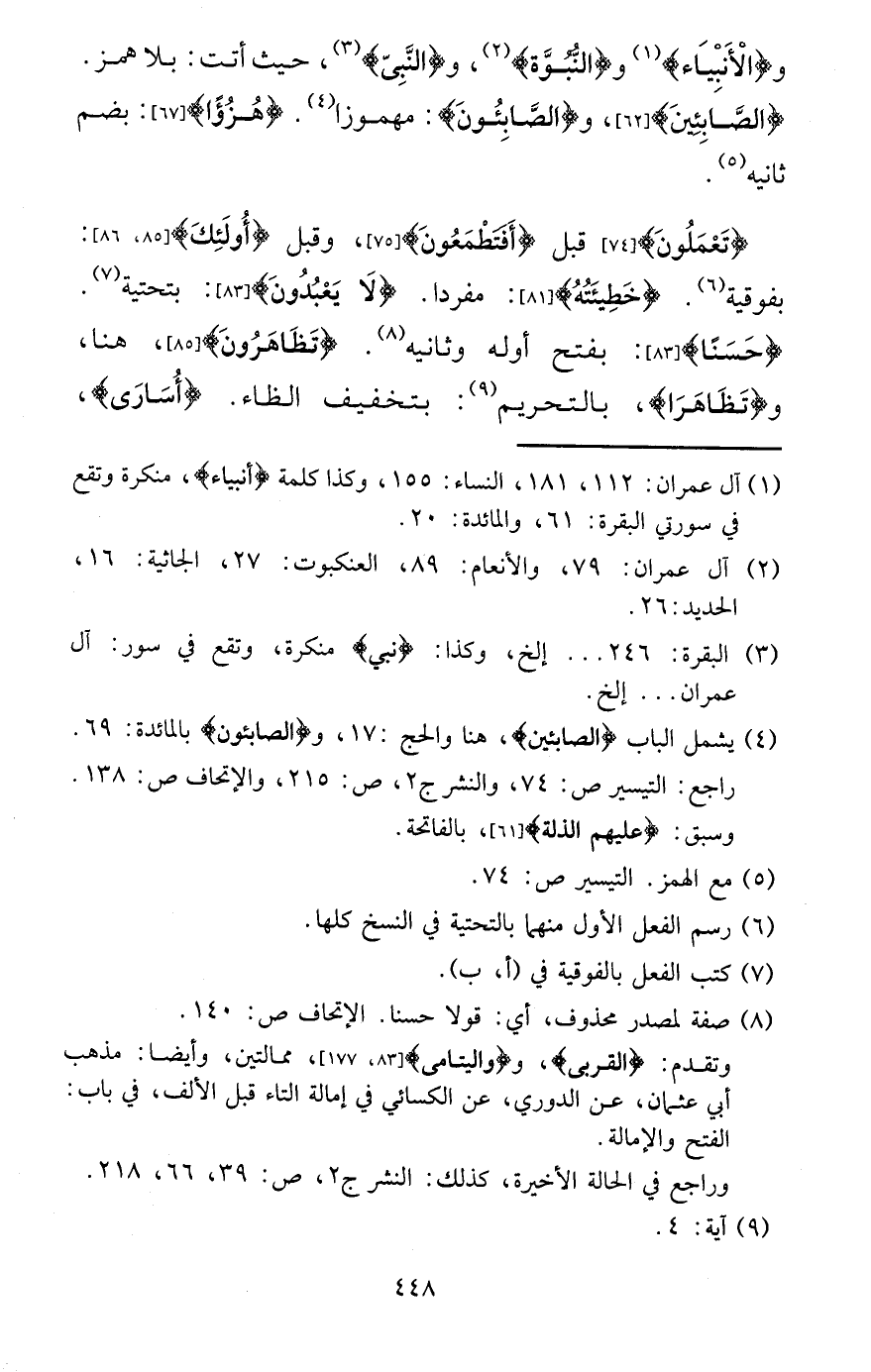 و {الْأَنْبِيَاء} و {النُّبُوَّة} ، و {النبى} ، حَيْثُ أَتَت: بِلَا همز. {الصابئين} ، و {الصابئون} : مهموزاً. {هزؤاً} : بِضَم ثَانِيه.