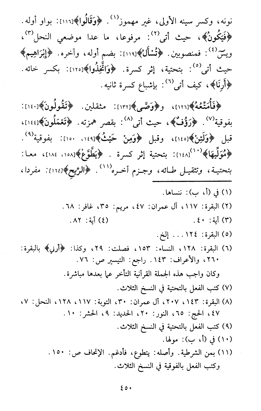{فأمتعه} ، و {وصّى} : مثقلين. {تَقولُونَ} : بفوقية. {رؤف} ، حَيْثُ أَتَى: بقصر همزته. {تَعْمَلُونَ} ، قبل {وَلَئِن} ، وَقبل {وَمن حَيْثُ} : بفوقية. {موليها} : بتحتية إِثْر كسرة. {يطوع} ، مَعًا: بتحتية، وتثقيل طائه، وَجزم آخِره. {الرّيح} : مُفردا،