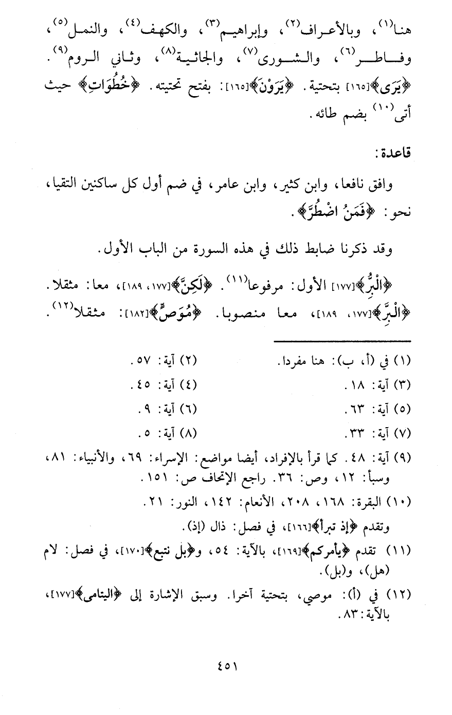 هُنَا، وبالأعراف، وَإِبْرَاهِيم، والكهف، والنمل، وفاطر، والشورى، والجاثية، وَثَانِي الرّوم. {يرى} بتحتية. {يرَوْنَ} : بِفَتْح تحتيته. {خطوَات} حَيْثُ أَتَى بِضَم طائه.