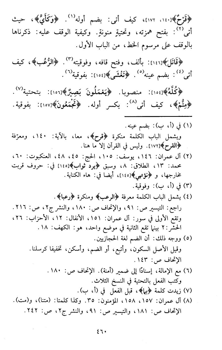 {قرح} ، كَيفَ أَتَى: بِضَم أَوله. {وكأي} ، حَيْثُ أَتَى: بِفَتْح همزته، وتحتية منونة. وَكَيْفِيَّة الْوَقْف عَلَيْهِ: ذَكرنَاهَا بِالْوَقْفِ على مرسوم الْخط، من الْبَاب الأول.