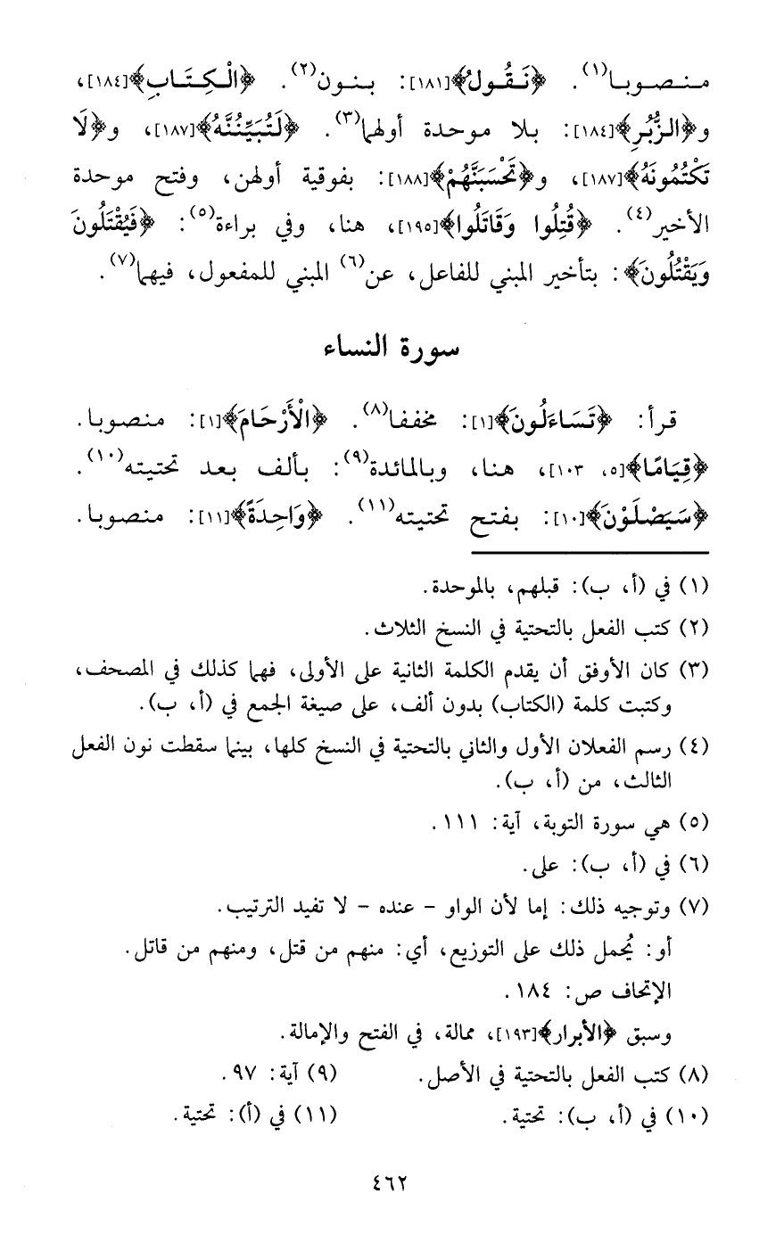 مَنْصُوبًا. {نقُول} : بنُون. {الْكتاب} ، و {الزبر} : بِلَا مُوَحدَة أَولهمَا. {لتبيننه} ، و {لَا تكتمونه} ، و {تحسبنهم} : بفوقية أولهنَّ، وَفتح مُوَحدَة الْأَخير. {قتلوا وقاتلوا} ، هُنَا، وَفِي بَرَاءَة: {فيقتلون وَيقْتلُونَ} : بِتَأْخِير الْمَبْنِيّ للْفَاعِل، عَن الْمَبْنِيّ للْمَفْعُول، فيهمَا.