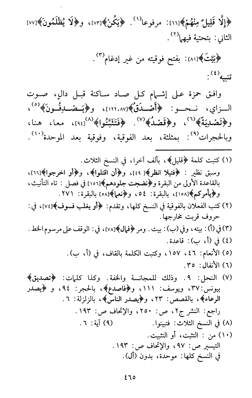 تَنْبِيه: وَافق حَمْزَة على إشمام كل صَاد سَاكِنة قبل دَال، صَوت الزَّاي، نَحْو: {أصدق} ، و {يصدفون} ، و {تصدية} ، و {قصد} . {فتثبتوا} ، مَعًا، هُنَا، وبالحجرات: بمثلثة، بعد الْفَوْقِيَّة، وفوقية بعد الْمُوَحدَة.
