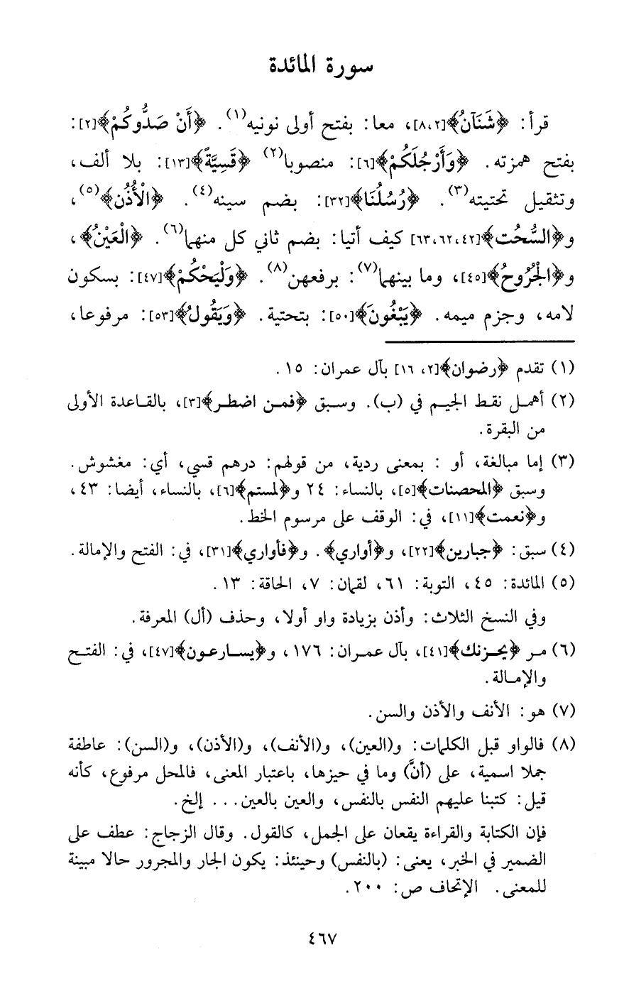 قَرَأَ: {شنآن} ، مَعًا: بِفَتْح أولى نونيه. {أَن صدوكم} : بِفَتْح همزته. {وأرجلكم} : مَنْصُوبًا {قسية} : بِلَا ألف، وتثقيل تحتيته. {رسلنَا} : بِضَم سينه. {الْأذن} ، و {السُّحت} كَيفَ أَتَيَا: بِضَم ثَانِي كل مِنْهُمَا. {الْعين} ، و {الجروح} ، وَمَا بَينهمَا: برفعهن. {وليحكم} : بِسُكُون لامه، وَجزم ميمه. {يَبْغُونَ} : بتحتية. {وَيَقُول} : مَرْفُوعا،