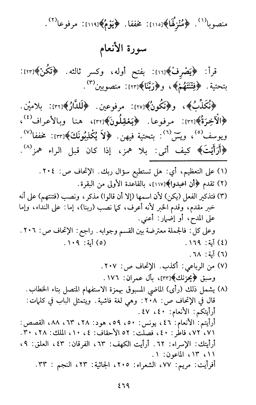 {نكذب} ، و {نَكُون} : مرفوعين. {للدَّار} : بلامين. {الْآخِرَة} : مَرْفُوعا. {يعْقلُونَ} ، هُنَا وبالأعراف، ويوسف، وَيس: بتحتية فِيهِنَّ. {لَا يكذبُونَك} : مخففا. {أَرَأَيْت} كَيفَ أَتَى: بِلَا همز، إِذا كَانَ قبل الرَّاء همز.