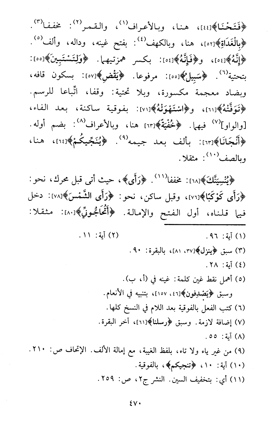 {فتحنا} ، هُنَا، وبالأعراف، وَالْقَمَر: مخففا. {بِالْغَدَاةِ} ، هُنَا، وبالكهف: بِفَتْح غينه، وداله، وَألف. {إِنَّه} ، و {فَإِنَّهُ} : بِكَسْر همزتيهما. {ولتستبين} : بتحتية. {سَبِيل} : مَرْفُوعا. {يقْض} : بِسُكُون قافه، وبضاد مُعْجمَة مَكْسُورَة، وَبلا تحتية: وَقفا، اتبَاعا للرسم. {توفته} ، و {استهوته} : بفوقية سَاكِنة، بعد الْفَاء، [وَالْوَاو] فيهمَا. {خُفْيَة} هُنَا، وبالأعراف: بِضَم أَوله. {أنجانا} : بِأَلف بعد جيمه. {ينجيكم} ، هُنَا، وبالصف: مُثقلًا.
