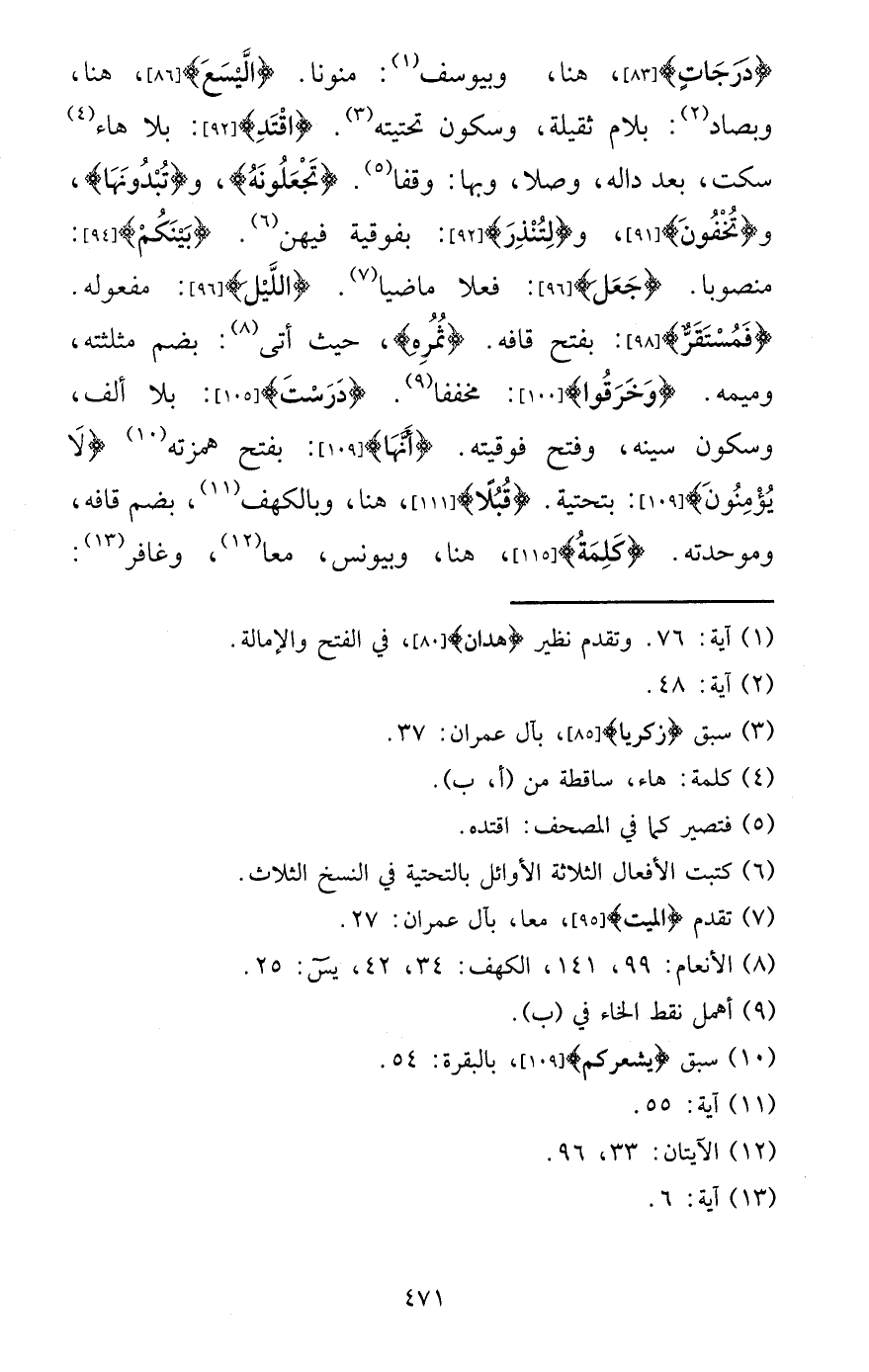 {دَرَجَات} ، هُنَا، وبيوسف: منونا. {اليسع} ، هُنَا، وبصاد: بلام ثَقيلَة، وَسُكُون تحتيته. {اقتد} : بِلَا هَاء سكت، بعد داله، وصلا، وَبهَا: وَقفا. {تجعلونه} ، و {تبدونها} ، و {تخفون} ، و {لتنذر} : بفوقية فِيهِنَّ. {بَيْنكُم} : مَنْصُوبًا. {جعل} : فعلا مَاضِيا. {اللَّيْل} : مَفْعُوله. {فمستقر} : بِفَتْح قافه. {ثمره} ، حَيْثُ أَتَى: بِضَم مثلثته، وميمه. {وخرقوا} : مخففا. {درست} : بِلَا ألف، وَسُكُون سينه، وَفتح فوقيته. {أَنَّهَا} : بِفَتْح همزته {لَا يُؤمنُونَ} : بتحتية. {قبلا} ، هُنَا، وبالكهف، بِضَم قافه، وموحدته. {كلمة} ، هُنَا، وبيونس، مَعًا، وغافر: