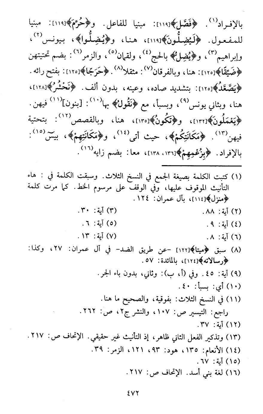 بِالْإِفْرَادِ. {فصل} : مَبْنِيا للْفَاعِل. و {حرم} : مَبْنِيا للْمَفْعُول. {ليضلون} ، هُنَا، و {يضلوا} ، بِيُونُس، وَإِبْرَاهِيم، و {يضل} بِالْحَجِّ، ولقمان، وَالزمر: بِضَم تحتيتهن {ضيقا} : هُنَا، وبالفرقان: مُثقلًا. {حرجا} : بِفَتْح رائه. {يصعد} : بتَشْديد صَاده، وعينه، بِدُونِ ألف. {نحْشر} ، هُنَا، وبثاني يُونُس، وبسبأ، مَعَ {نقُول} بهَا: [بنُون] فِيهِنَّ. {يعْملُونَ} ، و {تكون} ، هُنَا، وبالقصص: بتحتية فِيهِنَّ. {مكانتهم} ، حَيْثُ أَتَى، و {مكانتكم} ، بيس: بِالْإِفْرَادِ. {بزعمهم} ، مَعًا: بِضَم زايه.