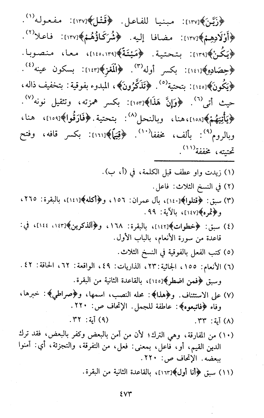 {زين} : مَبْنِيا للْفَاعِل. {قتل} : مَفْعُوله. {أَوْلَادهم} : مُضَافا إِلَيْهِ. {شركاؤهم} : فَاعِلا. {يكن} : بتحتية. {ميتَة} ، مَعًا، مَنْصُوبًا. {حَصَاده} : بِكَسْر أَوله. {الْمعز} : بِسُكُون عينه. {يكون} : بتحتية. {تذكرُونَ} ، المبدوء بفوقية: بتَخْفِيف ذاله، حَيْثُ أَتَى. {وَإِن هَذَا} : بِكَسْر همزته، وتثقيل نونه. {يَأْتِيهم} ، هُنَا، وبالنحل: بتحتية. {فارقوا} ، هُنَا، وبالروم: بِأَلف، مخففا. {قيمًا} : بِكَسْر قافه، وَفتح تحتيته، مُخَفّفَة.