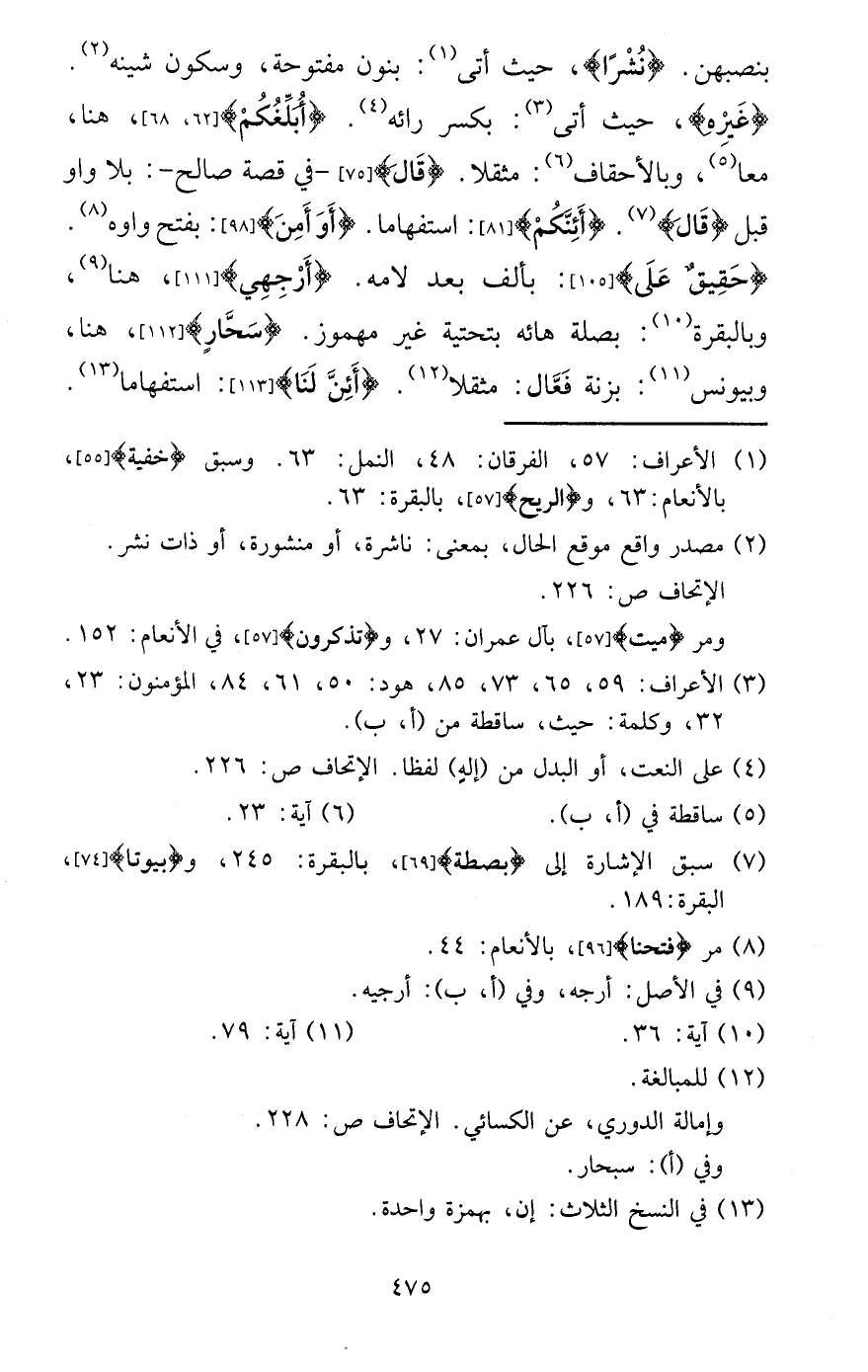 بنصبهن. {نشراً} ، حَيْثُ أَتَى: بنُون مَفْتُوحَة، وَسُكُون شينه. {غَيره} ، حَيْثُ أَتَى: بِكَسْر رائه. {أبلغكم} ، هُنَا، مَعًا، وبالأحقاف: مُثقلًا. {قَالَ} - فِي قصَّة صَالح -: بِلَا وَاو قبل {قَالَ} . {أئنكم} : استفهاما. {أَو أَمن} : بِفَتْح واوه. {حقيق على} : بِأَلف بعد لامه. {أرجهي} ، هُنَا، وبالبقرة: بصلَة هائه بتحتية غير مَهْمُوز. {سحار} ، هُنَا، وبيونس: بزنة فعال: مُثقلًا. {أئن لنا} : استفهاما.