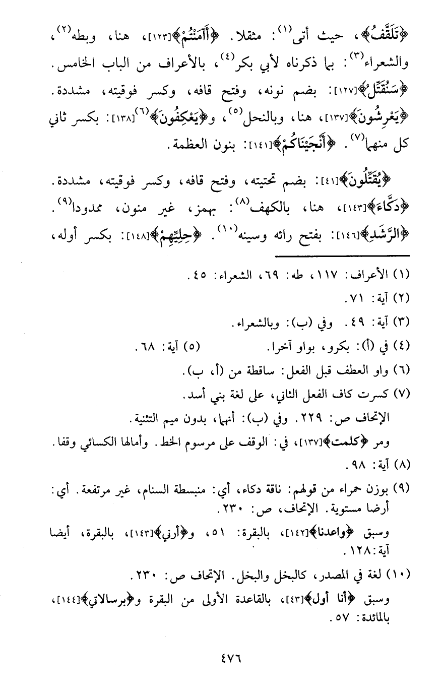 {يقتلُون} : بِضَم تحتيته، وَفتح قافه، وَكسر فوقيته، مُشَدّدَة. {دكاء} ، هُنَا، بالكهف: بهمز، غير منون، ممدوداً. {الرشد} : بِفَتْح رائه وسينه. {حليهم} : بِكَسْر أَوله،