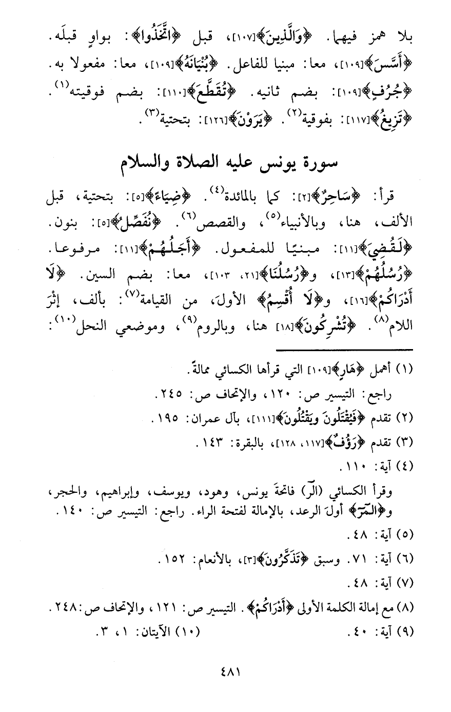 قَرَأَ: {سَاحر} : كَمَا بالمائدة. {ضِيَاء} : بتحتية، قبل الْألف، هُنَا، وبالأنبياء، والقصص. {نفصل} : بنُون. {لقضي} : مَبْنِيا للْمَفْعُول. {أَجلهم} : مَرْفُوعا. {رسلهم} ، و {رسلنَا} ، مَعًا: بِضَم السِّين. {لَا أدراكم} ، و {لَا أقسم} الأول، من الْقِيَامَة: بِأَلف، إِثْر اللَّام. {تشركون} هُنَا، وبالروم، وَمَوْضِعِي النَّحْل: