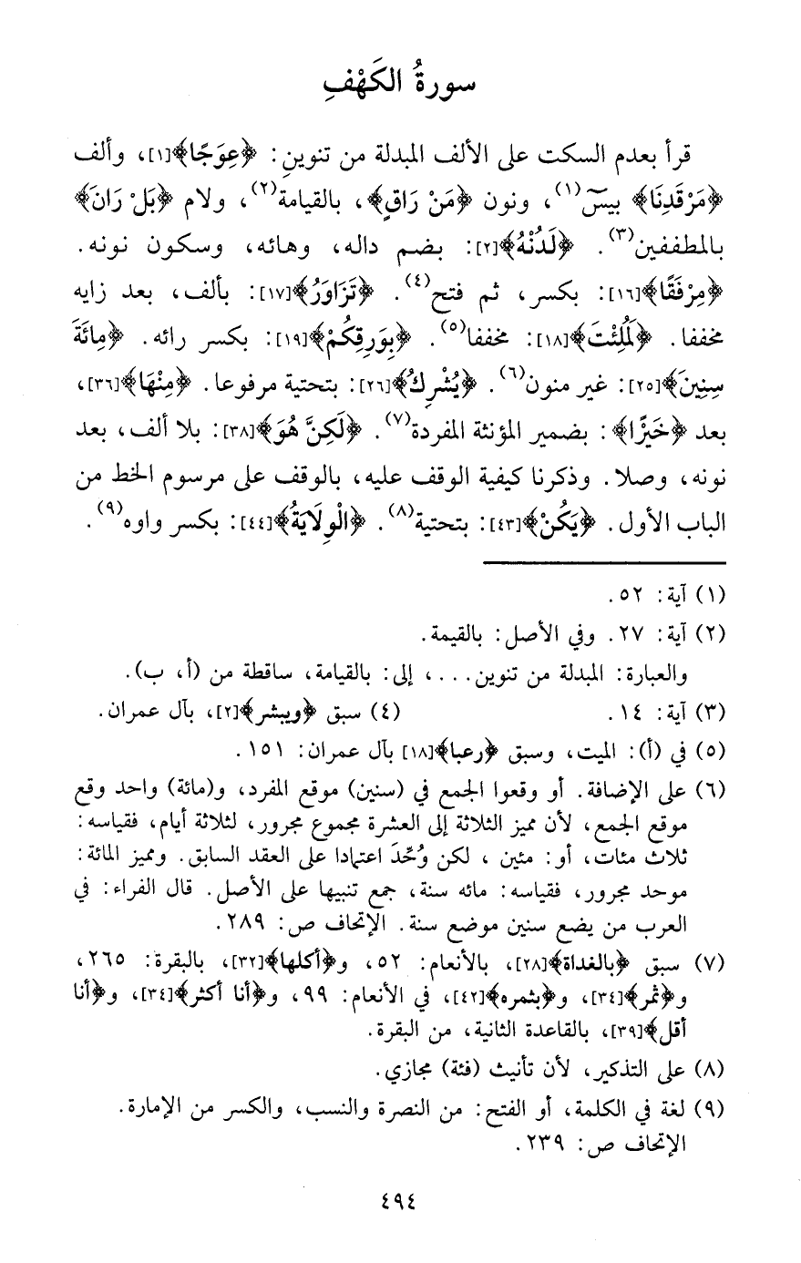 قَرَأَ بِعَدَمِ السكت على الْألف المبدلة من تَنْوِين: {عوجا} ، وَألف {مرقدنا} بيس، وَنون {من راق} ، بالقيامة، وَلَام {بل ران} بالمطففين. {لَدنه} : بِضَم داله، وهائه، وَسُكُون نونه. {مرفقا} : بِكَسْر، ثمَّ فتح. {تزاور} : بِأَلف، بعد زايه مخففا. {لملئت} : مخففا. {بورقكم} : بِكَسْر رائه. {مائَة سِنِين} : غير منون. {يُشْرك} : بتحتية مَرْفُوعا. {مِنْهَا} ، بعد {خيرا} : بضمير المؤنثة المفردة. {لَكِن هُوَ} : بِلَا ألف، بعد نونه، وصلا. وَذكرنَا كَيْفيَّة الْوَقْف عَلَيْهِ، بِالْوَقْفِ على مرسوم الْخط من الْبَاب الأول. {يكن} : بتحتية. {الْولَايَة} : بِكَسْر واوه.