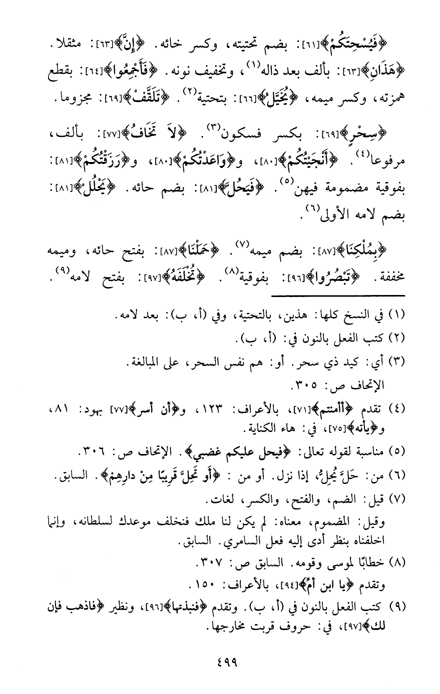 {سحر} : بِكَسْر فَسُكُون. {لَا تخَاف} : بِأَلف، مَرْفُوعا. {أنجيتكم} ، و {واعدتكم} ، و {رزقتكم} : بفوقية مَضْمُومَة فِيهِنَّ. {فَيحل} : بِضَم خائه. {يحلل} : بِضَم لامه الأولى.