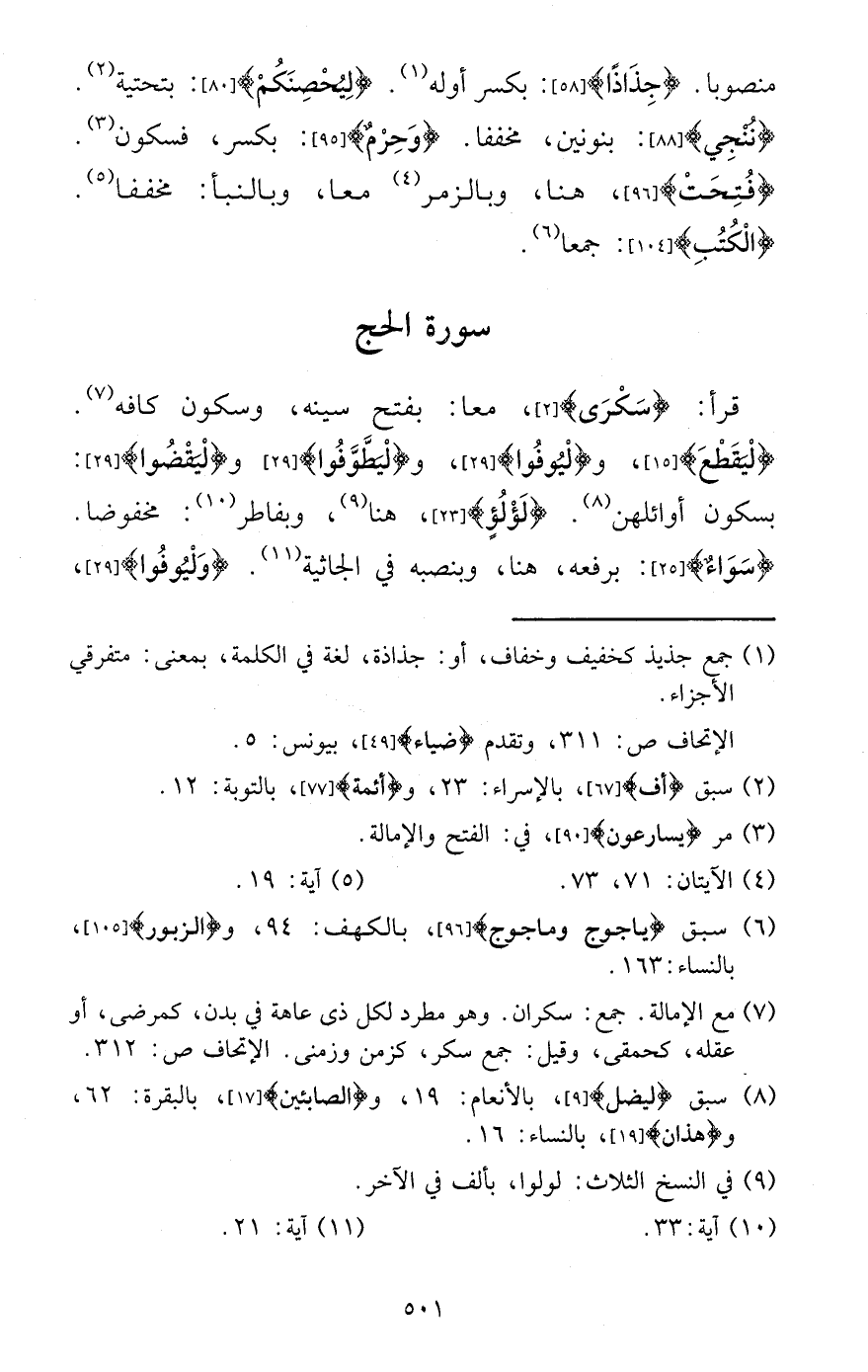 مَنْصُوبًا. {جذاذاً} : بِكَسْر أَوله. {ليحصنكم} : بتحتية. {ننجي} : بنونين، مخففا. {وَحرم} : بِكَسْر، فَسُكُون. {فتحت} ، هُنَا، وبالزمر مَعًا، وبالنبأ: مخففا. {الْكتب} : جمعا.