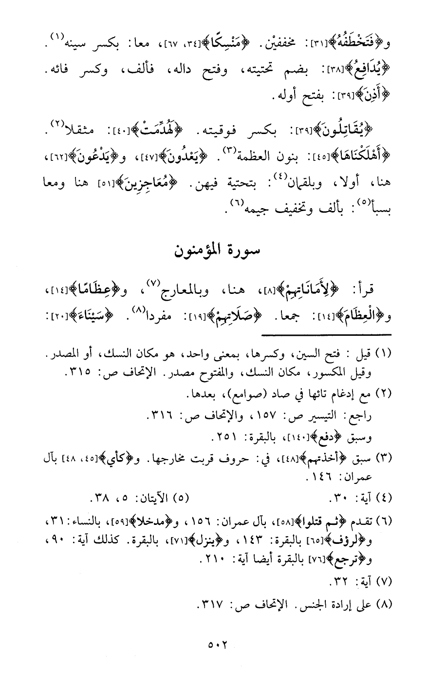 و {فتخطفه} : مخففين. {منسكا} ، مَعًا: بِكَسْر سينه. {يدافع} : بِضَم تحتيته، وَفتح داله، فألف، وَكسر فائه. {أذن} : بِفَتْح أَوله.