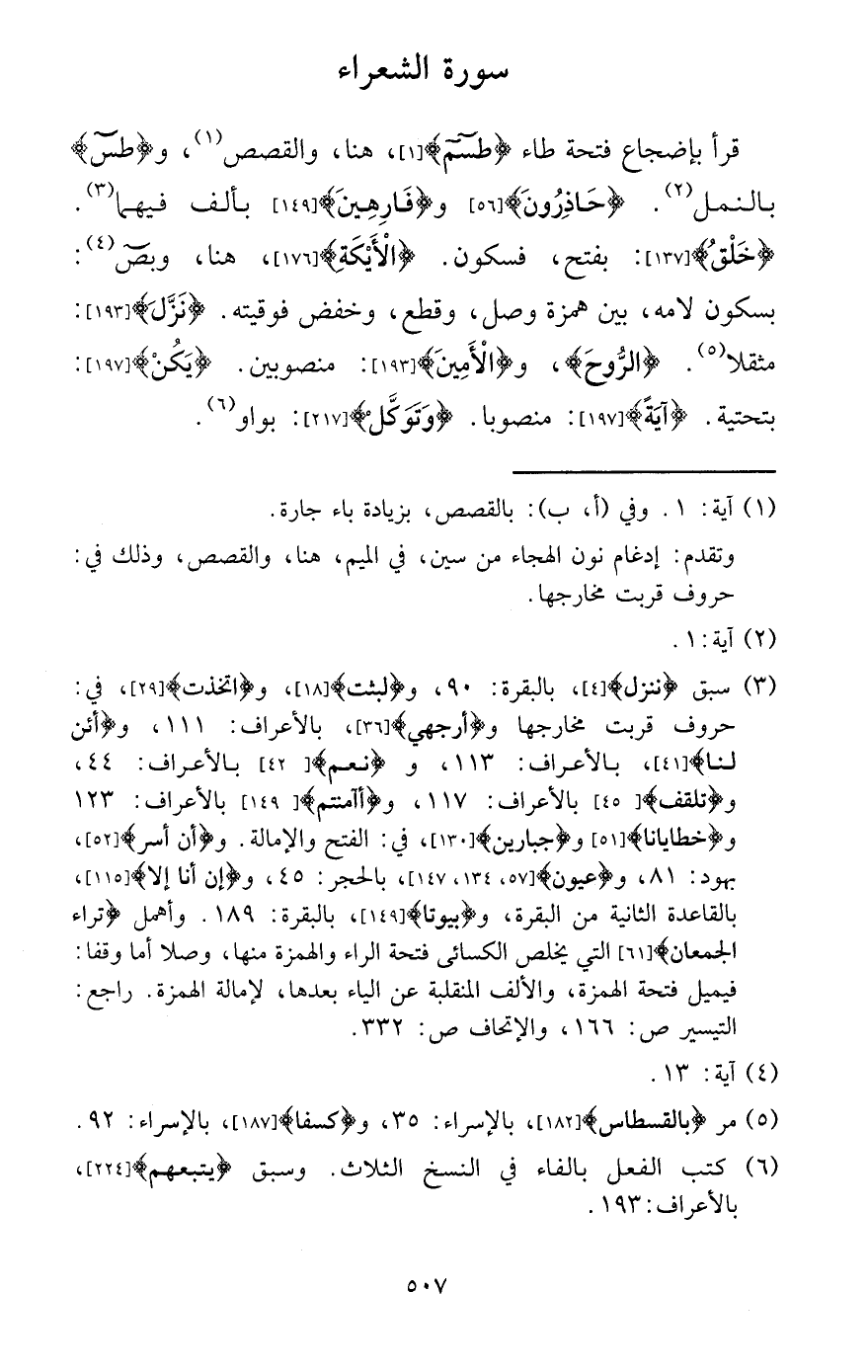 قَرَأَ بإضجاع فَتْحة طاء {طسم} ، هُنَا، والقصص، و {طس} بالنمل. {حاذرون} و {فارهين} بِأَلف فيهمَا. {خلق} : بِفَتْح، فَسُكُون. {الأيكة} ، هُنَا، وبص: بِسُكُون لامه، بَين همزَة وصل، وَقطع، وخفض فوقيته. {نزل} : مُثقلًا. {الرّوح} ، و {الْأمين} : منصوبين. {يكن} : بتحتية. {آيَة} : مَنْصُوبًا. {وتوكل} : بواو.