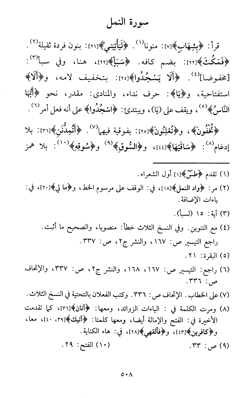 قَرَأَ: {بشهاب} : منونا. {ليأتيني} : بنُون فردة ثَقيلَة. {فَمَكثَ} : بِضَم كافه. {سبأ} ، هُنَا، وَفِي سبأ: [مخفوضاً] . {أَلا يسجدوا} : بتَخْفِيف لامه، و {أَلا} استفتاحية، و {يَا} : حرف نِدَاء، والمنادى: مُقَدّر، نَحْو {أَيهَا النَّاس} ، وَيقف على (يَا) ، ويبتدئ: {اسجدوا} على أَنه فعل أَمر.