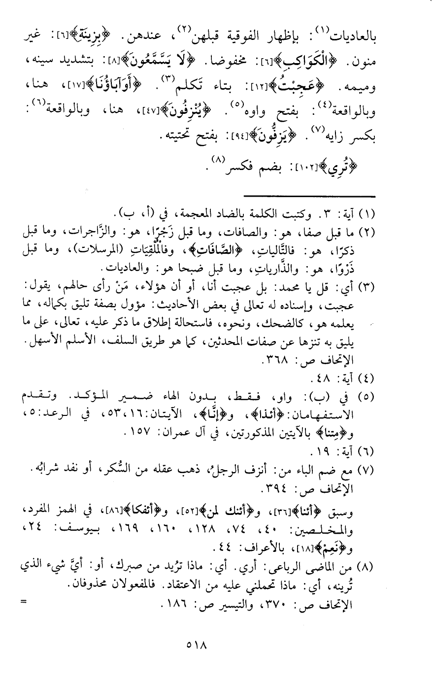 بالعاديات: بِإِظْهَار الْفَوْقِيَّة قبلهن، عِنْدهن. {بزينة} : غير منون. {الْكَوَاكِب} : مخفوضا. {لَا يسمعُونَ} : بتَشْديد سينه، وميمه. {عجبت} : بتاء تكلم. {أَو آبَاؤُنَا} ، هُنَا، وبالواقعة: بِفَتْح واوه. {ينزفون} ، هُنَا، وبالواقعة: بِكَسْر زايه. {يزفون} : بِفَتْح تحتيته.