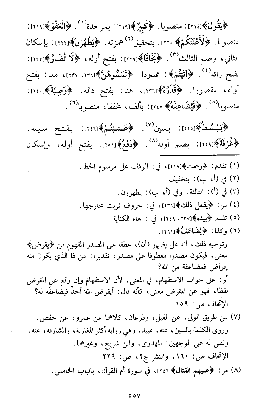 {يَقُول} : مَنْصُوبًا. {كَبِير} : بموحدة. {الْعَفو} : مَنْصُوبًا. {لأعنتكم} : بتحقيق همزته. {يطهرن} : بِإِسْكَان الثَّانِي، وَضم الثَّالِث. {يخافا} : بِفَتْح أَوله، {لَا تضار} : بِفَتْح رائه. {آتيتم} : ممدودا. {تمَسُّوهُنَّ} ، مَعًا: بِفَتْح أَوله، مَقْصُورا. {قدره} : هُنَا: بِفَتْح داله. {وَصِيَّة} : مَنْصُوبًا. {فيضاعفه} : بِأَلف، مخففا، مَنْصُوبًا.