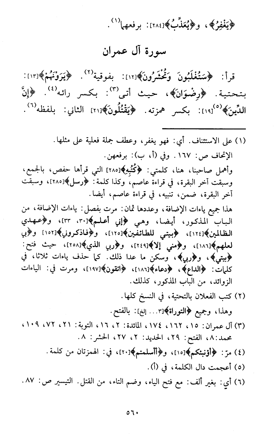 قَرَأَ: {ستغلبون وتحشرون} : بفوقية. {يرونهم} : بتحتية. {رضوَان} ، حَيْثُ أَتَى: بِكَسْر رائه. {إِن الدّين} : بِكَسْر همزته. {يقتلُون} الثَّانِي: بِلَفْظِهِ.