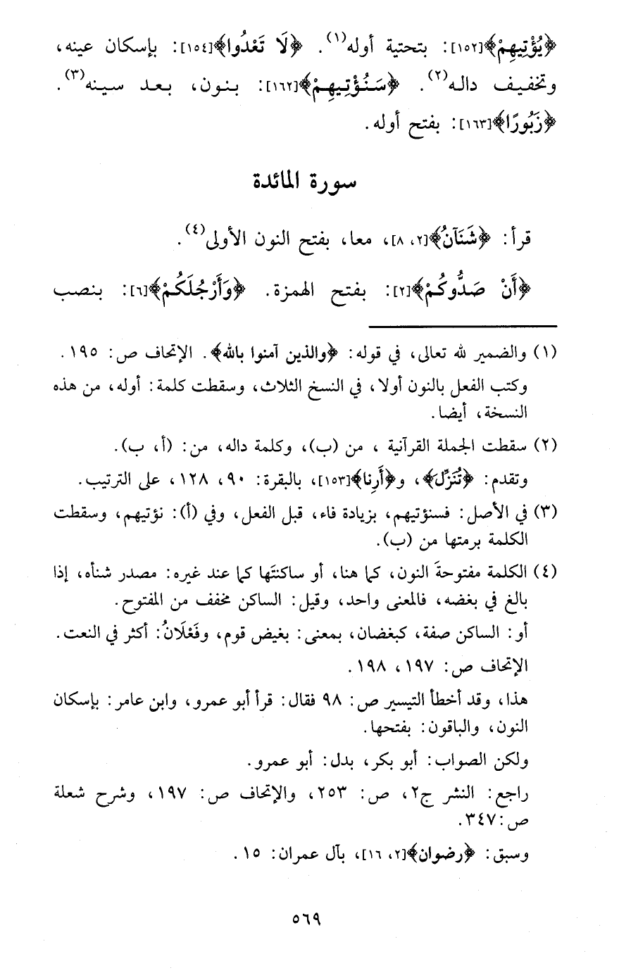 {يُؤْتِيهم} : بتحتية أَوله. {لَا تعدوا} : بِإِسْكَان عينه، وَتَخْفِيف داله. {سنؤتيهم} : بنُون، بعد سينه. {زبوراً} : بِفَتْح أَوله.