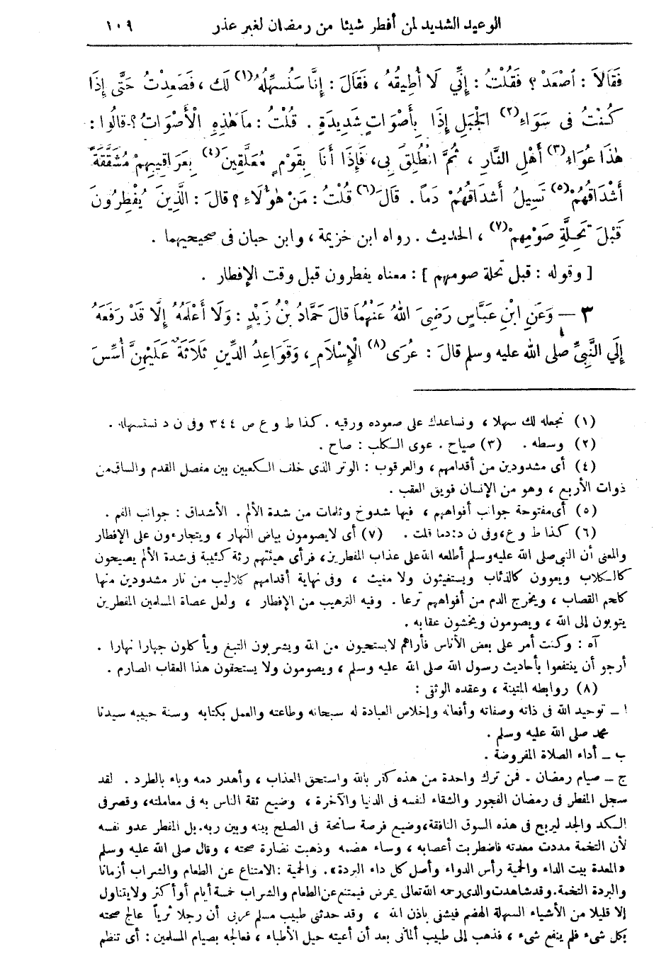 فقالا: أصْعَدْ؟ فقلتُ: إنِّي لا أطيقه، فقال: إنَّا سنسهِّله (¬1) لك فصعدْتُ حتى إذا كنت في سواء (¬2) الجبل إذا بأصواتٍ شديدة. قلت: ما هذه الأصوات؟ قالوا: هذا عواء (¬3) أهل النار، ثمَّ انطلق بي، فإذا أنا بقومٍ مُعلَّقين (¬4) بعراقيبهم مشقَّقَةَ أشداقهمْ (¬5) تسيل أشداقهم دماً. قال (¬6) قلت: من هؤلاء؟ قال: الذين يفطرون قبل تحلَّةِ صومهمْ (¬7)،