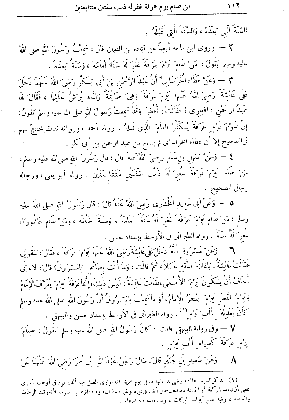 3 - وعن عطاء الخرساني أنَّ عبد الرَّحمن بن أبي بكر رضي الله عنهما دخل على عائشة رضي الله عنها يوم عرفة وهي صائمة، والماء يرشُّ عليها، فقال لها عبدُ الرَّحمن: أفطري؟ فقالت: أفطرُ، وقد سمعت رسول الله صلى الله عليه وسلم يقول: إنَّ صوم يوم عرفة يكفِّرُ العام الذي قبله رواه أحمد ورواته ثقات محتاج بهم في الصحيح أن عطاء الخرساني لم يسمع من عبد الرحمن بن أبي بكر.