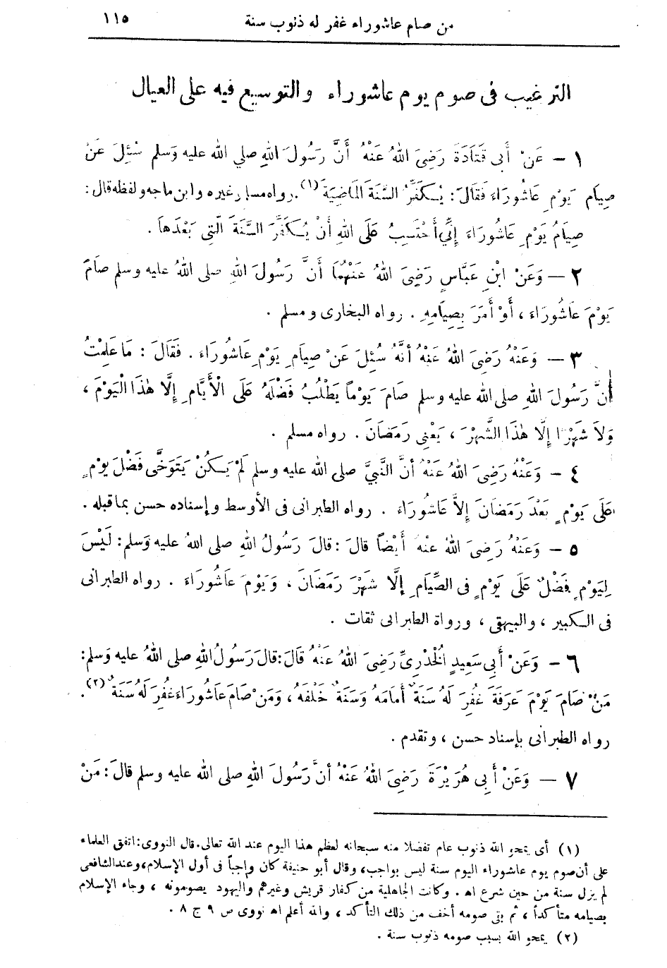 6 - وعنْ أبي سعيدٍ الخدريِّ رضي الله عنه قال: قال رسول الله صلى الله عليه وسلم: من صام يومَ عرفة غفر له سنة أمامه وسنة خلْفَهُ، ومنْ صام عاشوراء غفر لهُ سنةٌ (¬2). رواه الطبراني بإسناد حسن، وتقدم.