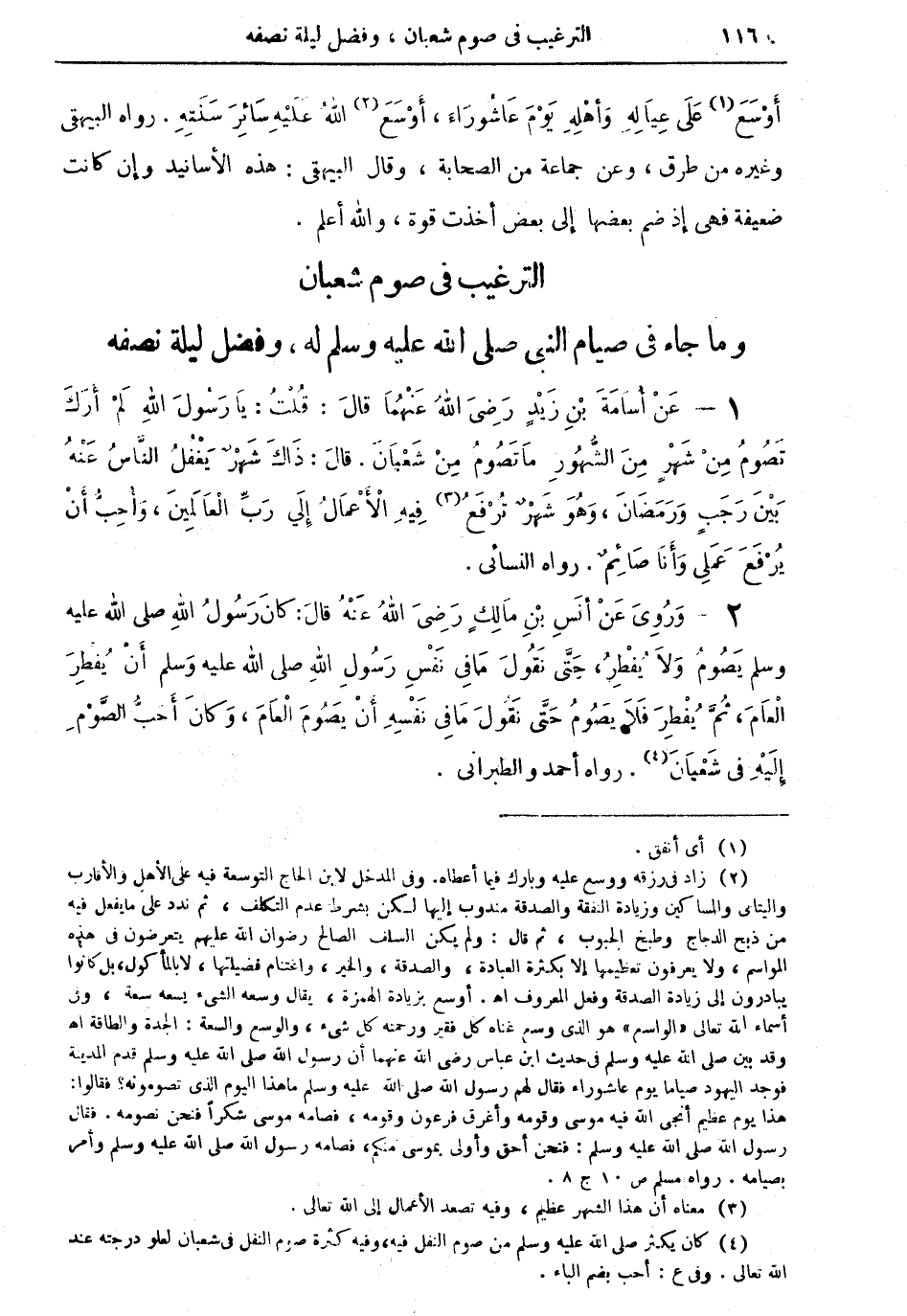 1 - عنْ أسامة بن زيدٍ رضي الله عنهما قال: قُلْتُ: يا رسول الله لمْ أرَكَ تصومُ من شهرٍ من الشهور ما تصوم من شعبان. قال: ذاك شهرٌ يغفلُ النَّاس عنه بين رجبٍ ورمضان، وهو شهرٌ ترفع (¬3) فيه الأعمال إلى ربِّ العالمين، وأحبُّ أنْ يرْفع عملي وأنا صائم. رواه النسائي.
