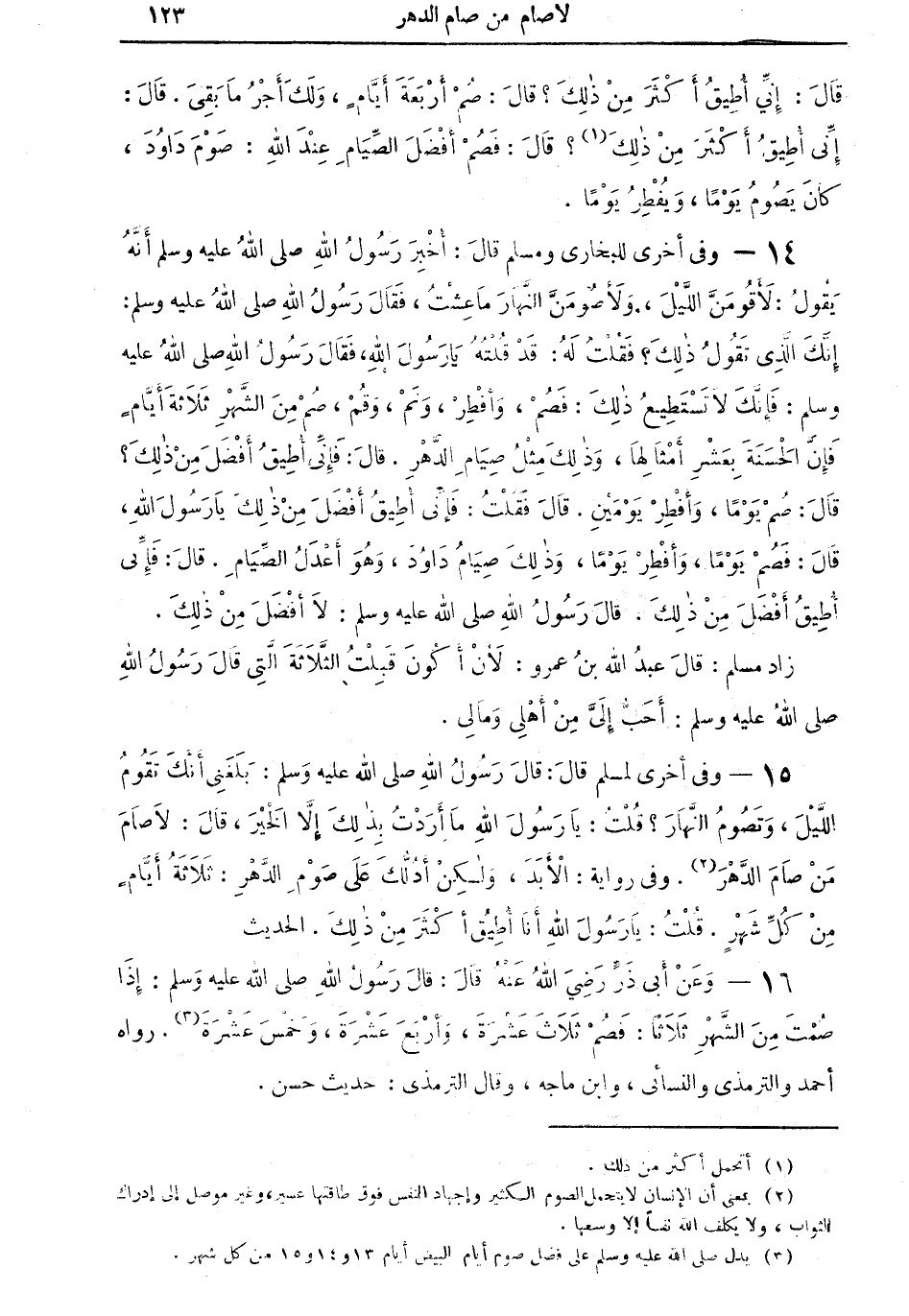 14 - وفي أخرى للبخاري ومسلم قال: أخبر رسول الله صلى الله عليه وسلم انَّه يقول: لأقومنَّ الليل، ولأصومنَّ النَّهار ما عشت، فقال رسول الله صلى الله عليه وسلم: إنَّك الذي تقول ذلك؟ فقلتُله: قدْ قُلْتُهُ يا رسول الله، فقال رسول الله صلى الله عليه وسلم: فإنَّك لا تستطيع ذلك: فصمْ، وأفْطرْ، ونمْ، وقمْ، صمْ من الشَّهر ثلاثة أيامٍ فإنَّ الحسنة بعشر أمثالها، وذلك مثل صيام الدَّهر. قال: فإني أطيق أفضل في ذلك؟ قال: صمْ يوماً، وأفطرْ يومين. قال فقلتُ: فإنِّي أطيق أفضل من ذلك يا رسول الله، قال: فصمْ يوماً، وأفطرْ يوماً، وذلك صيام داود، وهو أعدل الصِّيام. قال: فإنِّي أطيق أفضل من ذلك. قال رسول الله صلى الله عليه وسلم: لا أفضل من ذلك.