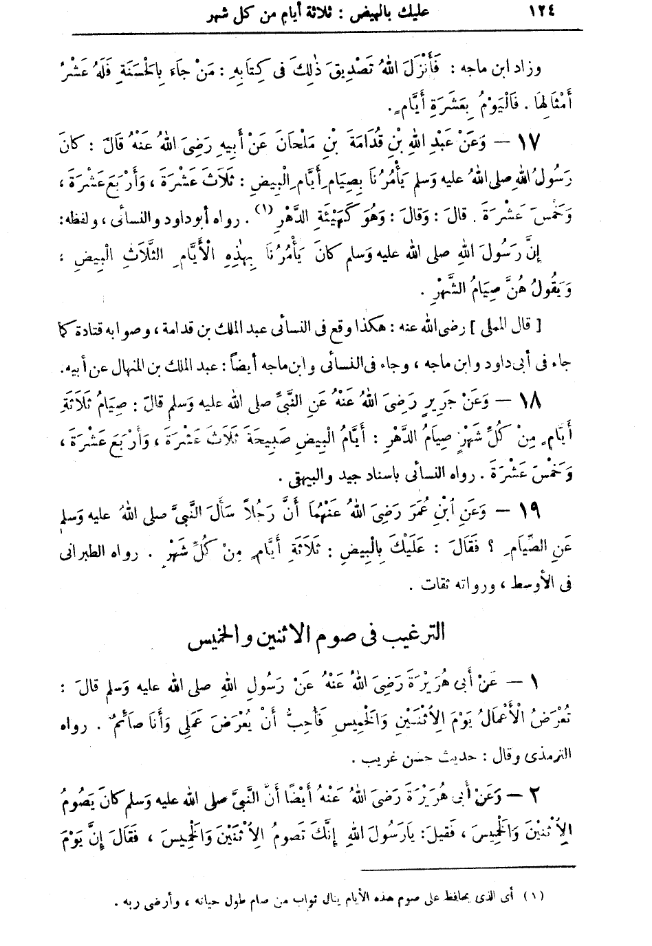 17 - وعنْ عبد الله بن قدامة بن ملحان عن أبيه رضي الله عنه قال: كان رسول الله صلى الله عليه وسلم يأمرنا بصيام أيام البيضِ: ثلاثة عشرة، وأربع عشرة، وخمس عشرة. قال وقال: وهو كهيئة الدَّهر (¬1). رواه أبو داود والنسائي، ولفظه:
