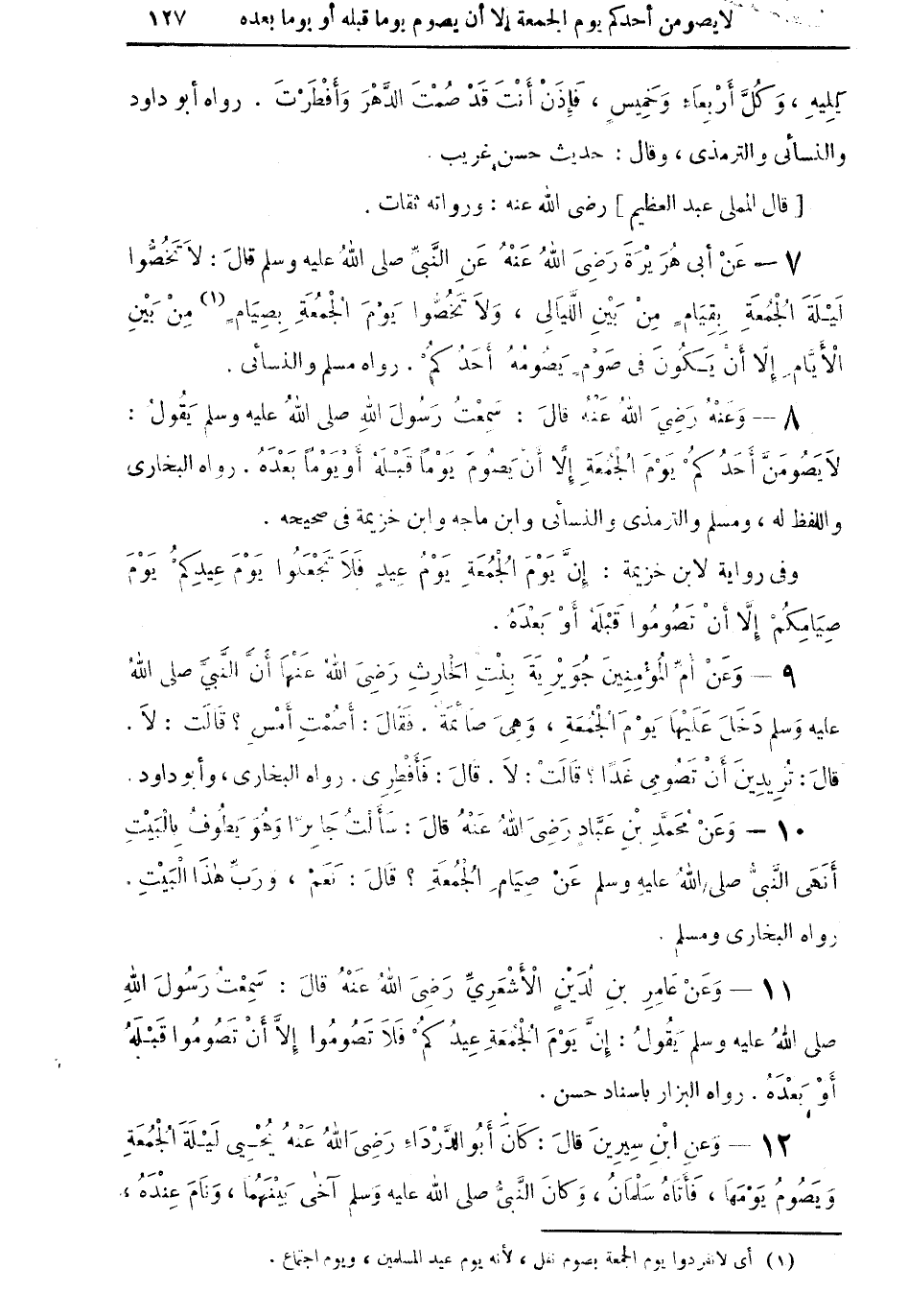 8 - وعنْهُ رضي الله عنه قال: سمعتُ رسول الله صلى الله عليه وسلم يقول: لا يصومنَّ أحدكمْ يوم الجمعةِ رلا أن يصومَ يوماً قبله أو يوما بعده. رواه البخاري واللفظ له، ومسلم والترمذي والنسائي وابن ماجه وابن خزيمة في صحيحه.