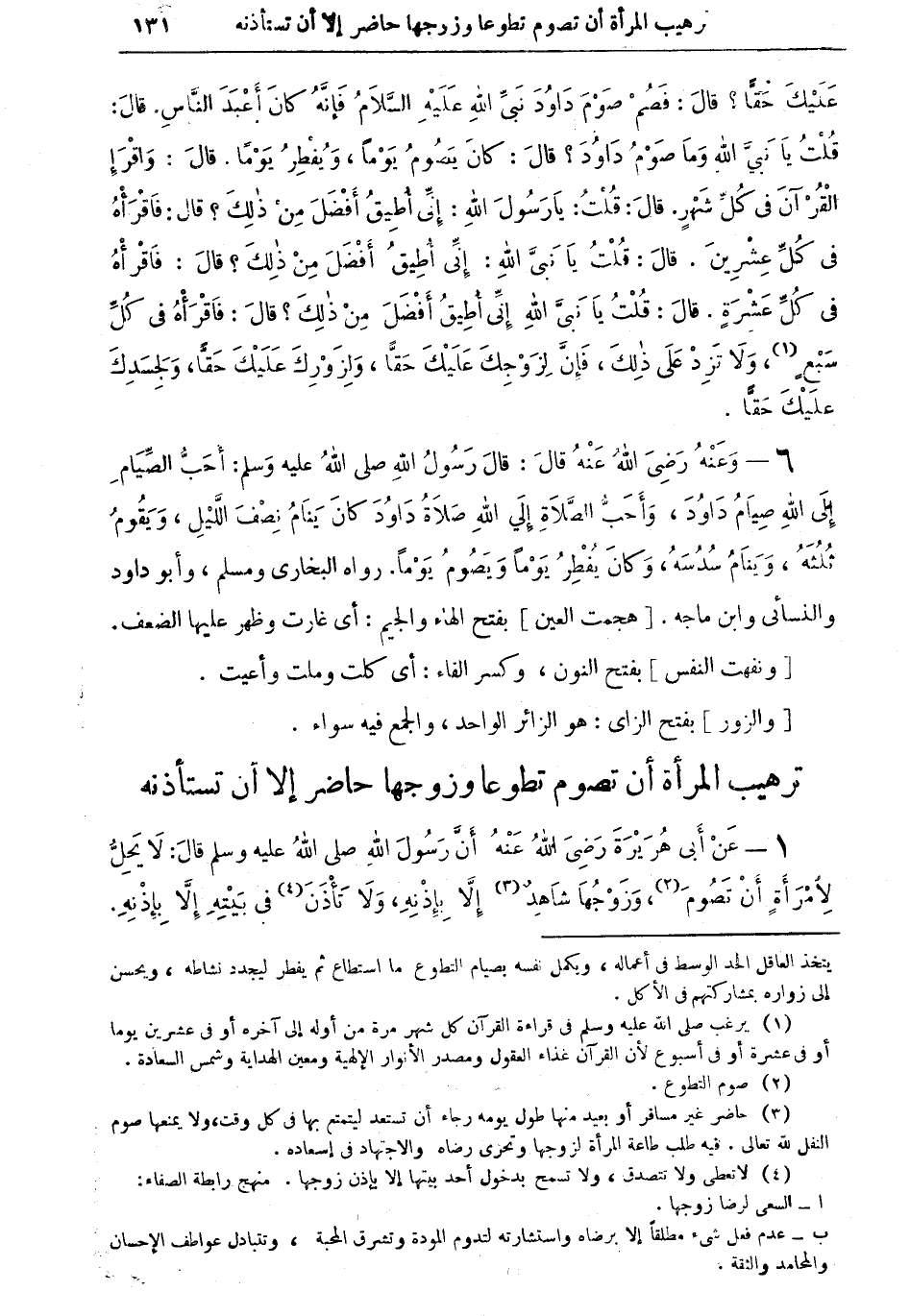 (¬3) حاضر غير مسافر، أو بعيد منها طول يومه رجاء أن تستعد ليتمتع بها في كل وقت، ولا يمنعها صوم النفل لله تعالى. فيه طلب طاعة المرأة لزوجها، وتحري رضاه والاجتهاد في إسعاده.