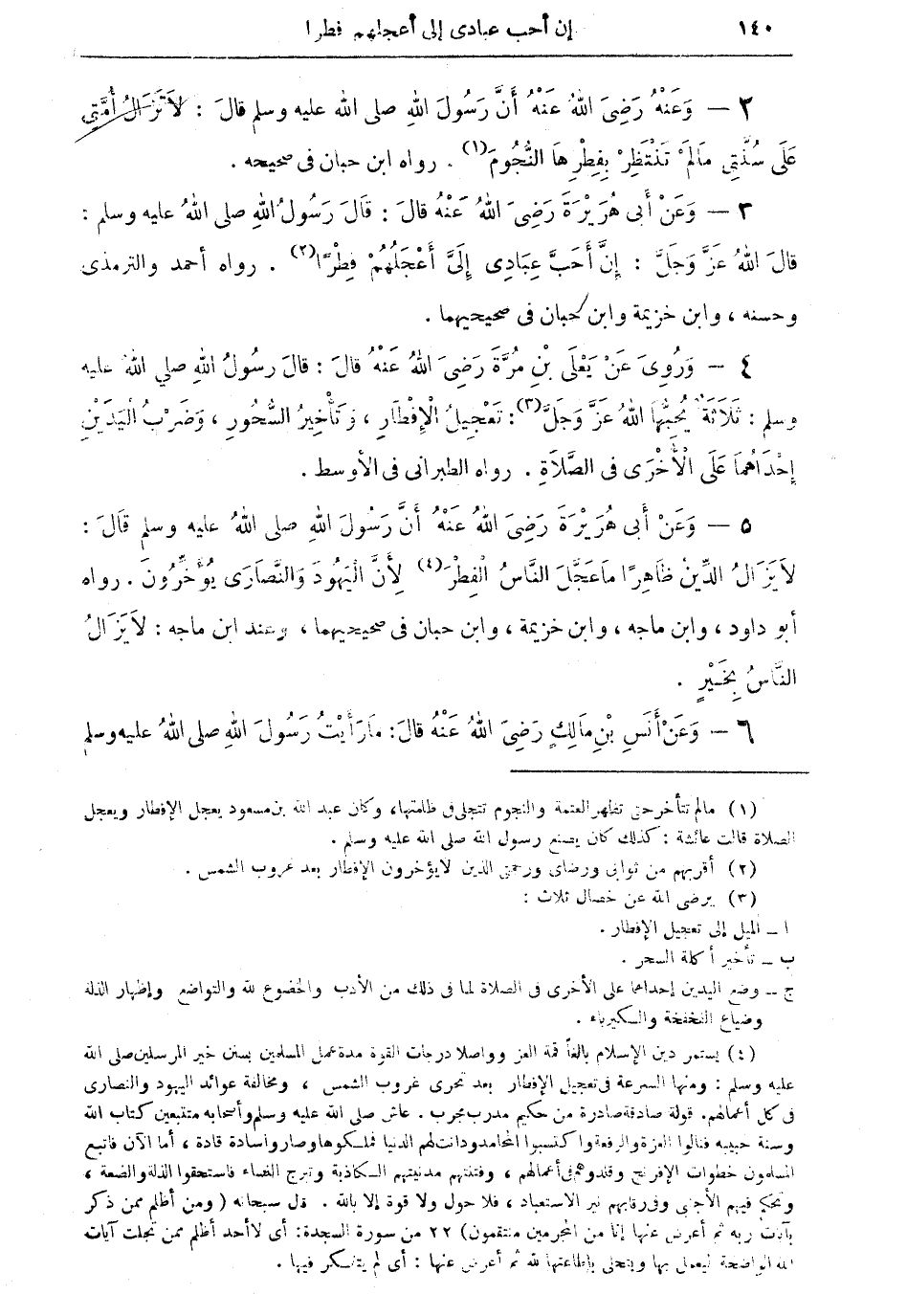 3 - وعنْ أبي هريرة رضي الله عنه قال: قال رسول الله صلى الله عليه وسلم: قال الله عزَّ وجلَّ: إنَّ أحبَّ عبادي إليَّ أعجلهم فطراً (¬2). رواه أحمد والترمذي وحسنه، وابن خزيمة وابن حبان في صحيحهما.
