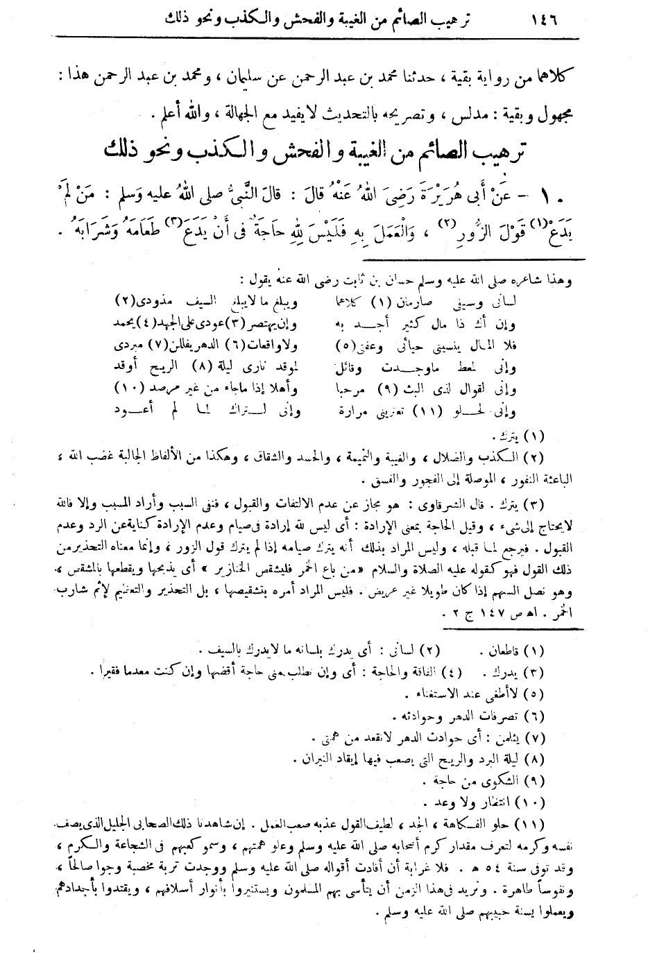 (3) يترك. قال الشرقاوي: هو مجاز عن عدم الالتفات والقبول، فنفي السبب وأراد المسبب، وإلا فالله لا يحتاج إلى شيء، وقيل الحاجة بمعنى الإادة: أي ليس لله إرادة في صيام، وعدم الإرادة كناية عن الرد وعدم القبول. فيرجع لما قبله، وليس المراد بذلك أنه يترك صيامه إذا لم يترك قول الزور، وإنما معناه التحذير من ذلك القول. فهي كقوله عليه الصلاة والسلام: (من باع الخمر فليشقص الخنازير) أي يذبحها ويقطعها بالمشقص، وهو نصل السهم إذا كان طويلا غير غريض. فليس المراد أمره بتشقيصها، بل التحذير والتعظيم لإثم شارب الخمر. أهـ ص 147 جـ 2.