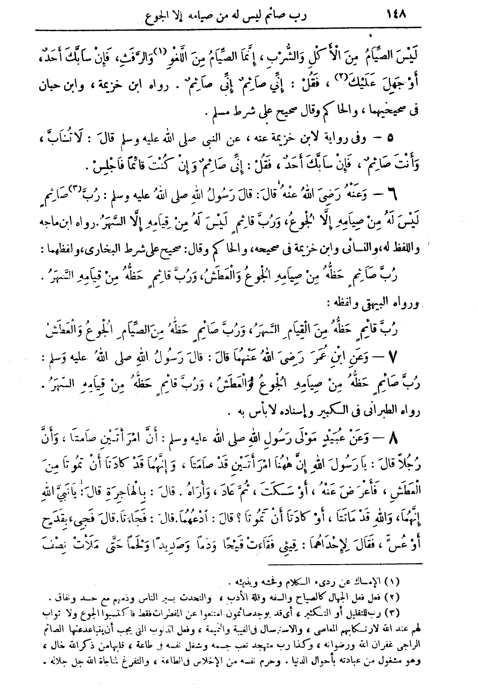 7 - وعن ابن عمر رضي الله عنهما قال: قال رسول الله صلى الله عليه وسلم: ربَّ صائمٍ حظُّه من صيامهِ الجوع والعطش، وربَّ قائمٍ حظُّه من قيامهِ السَّهر. رواه الطبرانيُّ في الكبير، وإسناده لا بأس به.