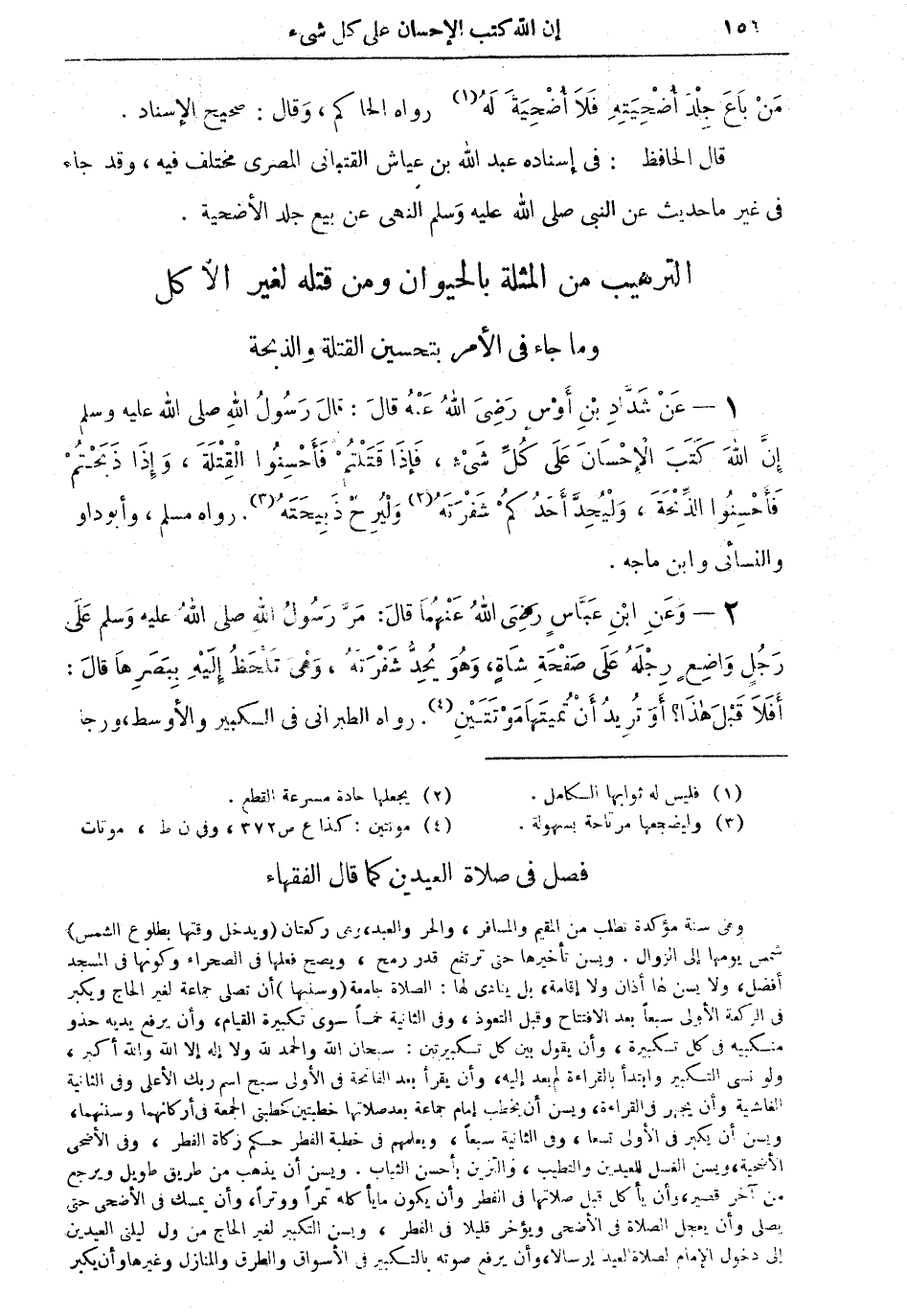 عنْ شداد بن أوْس رضي الله عنه قال: قال رسول الله صلى الله عليه وسلم إنَّ الله كتب الإحسان على كلِّ شيءٍ، فإذا قتلتمْ فأحسنوا القتلةَ، وإذا ذبحتمْ فأحسنوا الذِّبحة، ولْيُحدَّ أحدكمْ شفرتهُ (¬2) وليرح ذبيحته (¬3). رواه مسلم، وأبو داود والنسائي وابن ماجه.
