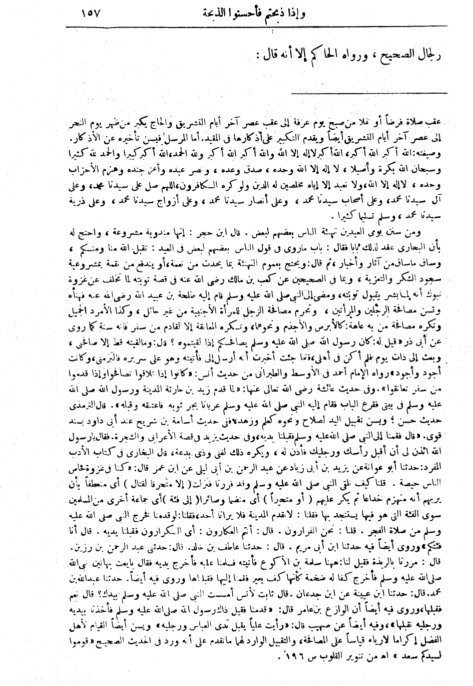 ومن سنن يومي العيدين تهنئة الناس بعضهم لبعض. قال ابن حجر: إنها مندوبة مشروعة، واحتج له بأن البخاري عقد لذلك بابا فقال: باب ما روي في قول الناس بعضهم لبعض في العيد: تقبل الله منا ومنكم، وساق ما ساق من آثار وأخبار، ثم قال: ويحتج بعموم التهنئة بما يحدث من نعمة أو يندفع من نقمة بمشروعية سجود الشكر والتعزية، وبما في الصحيحين عن كعب بن مالك رضي الله عنه في قصة توبته لما تخلف عن غزوة تبوك أنه لما بشر بقبول توبته، ومضى إلى النبي صلى الله عليه وسلم قال إليه طلحة بن عبيد الله رضي الله عنه فهنأه. وتسن مصافحة الرجلين والمرأتين، وتحرم مصافحة الرجل للمرأة الأجنبية عن غير حائل، وكذا الأمرد الجميل. وتكره مصافحة من به عاهة: كالأبرص والأجذم ونحوهما، وتكره المعانقة إلا لقادم من سفر فانه سنة كما روي عن أبي ذر (قيل له: كان رسول الله صلى الله عليه وسلم يصفاحكم إذا لقيتموه؟ قال: وما لقيته قط إلا صافحني، وبعث إلى ذات يوم فلم أكن في أهلي، فلما جئت أخبرت أنه أرسل إلى فأتيته وهو على سريره فالتزمني، وكانت أجود وأجود) رواه الإمام أحمد في الأوسط والطبراني من حديث أنس: (كانوا إذا تلاقوا تصافحوا، وإذا قدموا من سفر تعانقوا). وفي حديث عائشة رضي الله عنها: (لما قدم زيد بن حارثة المدينة ورسول الله صلى الله عليه وسلم في بيتي فقرع الباب فقام إليه النبي صلى الله عليه وسلم عيرانا يجر ثوبه. فاعتنقه وقبله). قال الترمذي حديث حسن، ويسن تقبيل اليد لصلاح ونحوه كعلم وزهد، ففي حديث أسامة بن شريح عند أبي داود بسند قوي. (قال فقمنا إلى النبي صلى الله عليه وسلم فقبلنا يديه، وفي حديث يزيد في قصة الأعرابي والشجرة. فقال يا رسول الله ائذن لي أن أقبل رأسك ورجليك أذن له، ويكره ذلك لغني وذي بدعة، قال البخاري في كتاب الأدب المفرد: حدثنا أبو عوانة عن يزيد بن أبي زياد عن عبد الرحمن بن أبي ليل عن ابن عمر قال: (كنا في غزوة فحاص الناس حيصة. قلنا كيف نلقى النبي صلى الله عليه وسلم وقد فررنا فنزلت (إلا متحرفا لقتال) أي منعطفاً بأن يريهم أنه منهزم خداعا ثم يكر عليهم (أو متحيزاً) أي منضما وصائرا (إلى فئة) أي جماعة أخرى من المسلمين سوى الفئة التي هو فيها يستنجد بها فقلنا: لا نقدم المدينة فلا يرانا أحد، فقلنا: لو قدمنا فخرج النبي صلى الله عليه وسلم من صلاة الفجر. قلنا: نحن الفرارون. قال أنتم: المكارون: أي الكرارون فقبلنا يديه. قال أنا فئتكم) وروي أيضاً فيه حدثنا ابن أبي مريم. قال: حدثنا عاطف بن خالد. قال حدثني عبد الرحمن بن رزين.