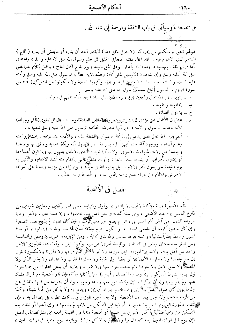 فأما الأضحية فسنة مؤكدة لا تجب إلا بالنذر، وأول وقتها بعد مضى قدر ركعتين، وخطبتين خفيفتين من طلوع الشمس يوم عيد الأضحى، وهي سنة كفاية في حق أهل بيت تعددوا، وإلا فسنة عين. وآخر وقتها غروبالشمس من آخر أيام التشريق، فمن لم يضح حتى مضى الوقت. فان كان تطوعا لم يذبح بقصد التضحية، وإن كان منذوراً لزمه أن يضحي قضاء، وتكون بذبح جذعة ضأن لها سنة: وطعنت في الثانية، أو ستة أشهر وسقط بعض أسنانها، أو ثنية معزلها سنتان وطعنت في الثانية: ومن الإبل ما له خمس سنين وطعن في السادسة.