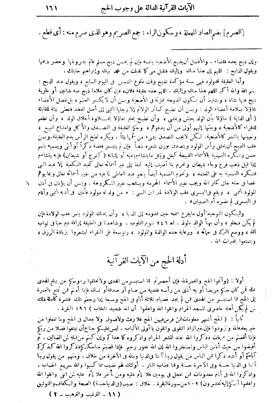 ثانياً: (الحج أشهر معلومات فمن فرض فيهن الحج فلا رفث ولا فسوق ولا جدال في الحج وما تفعلوا من خير يعلمه الله وتزودوا فإن خير الزاد التقوى واتقون يا أولي الألباب. ليس ع ليكم جناح أن تبتغوا فضلا من ربكم فإذا أفضتم من عرفات فاذكروا الله عند المشعر الحرام واذكروه كما هداكم وإن كنتم من قبله لمن الضالين. ثم أفيضوا من حيث أفاض الناس واستغفروا الله إن الله غفور رحيم فإذا قضيتم مناسككم فاذكروا الله كذكركم آباءكم أو أشد ذكرا فمن الناس من يقول ربنا آتنا في الدنيا وما له في الآخرة من خلاق. ومنهم من يقول ربنا آتنا في الدنيا حسنة وفي الآخرة حسنة وقنا عذاب النار. أولئك لهم نصيب مما كسبوا والله سريع الحساب. واذكروا الله في أيام معدودات فمن تعجل في يومين فلا إثم عليه ومن تأخر تفلا إثم عليه لمن اتقى واتقوا الله واعلموا أنكم إليه تحشرون) 102 من سورة البقرة. خلاق: نصيب (في الدنيا حسنة) الصحة والكفاف والتوفيق =