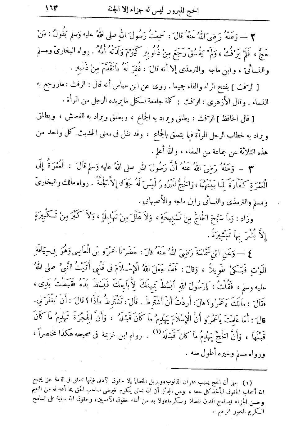 3 - وعنْهُ رضي الله عنه أنَّ رسول الله صلى الله عليه وسلم قال: العمْرةُ إلى العمرة كفَّارة لما بينهما، والحجُّ المبرور ليْس له جزاء إلا الجنة. رواه مالك والبخاريّ ومسلم والترمذي والنسائي وابن ماجه والأصبهاني.