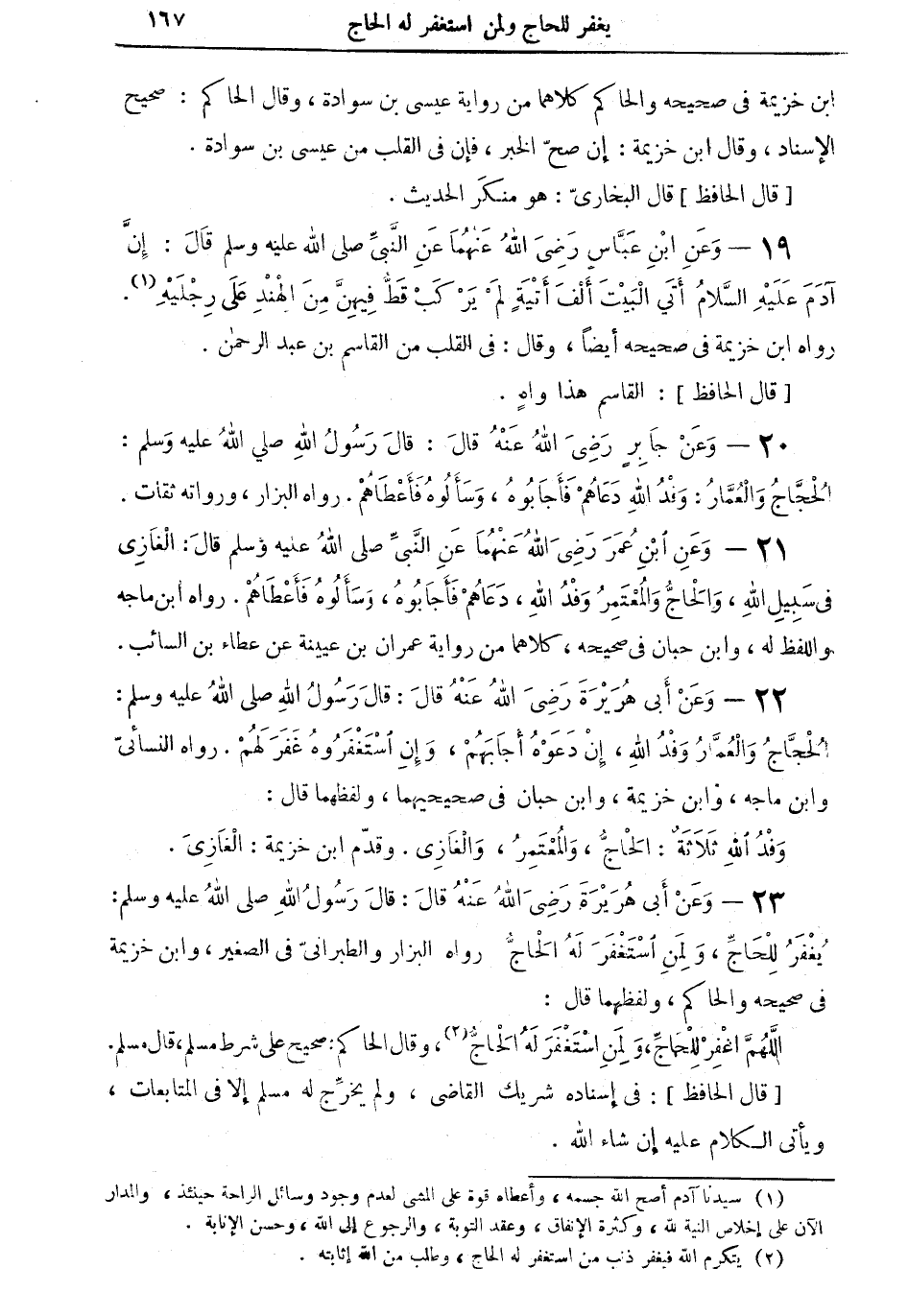 20 - وعنْ جابرٍ رضي الله عنه قال: قال رسول الله صلى الله عليه وسلم: الحجَّاج والعمَّارُ: وفد الله دعاهمْ فأجابوه، وسألوه فأعطاهم. رواه البزار، ورواته ثقات.
