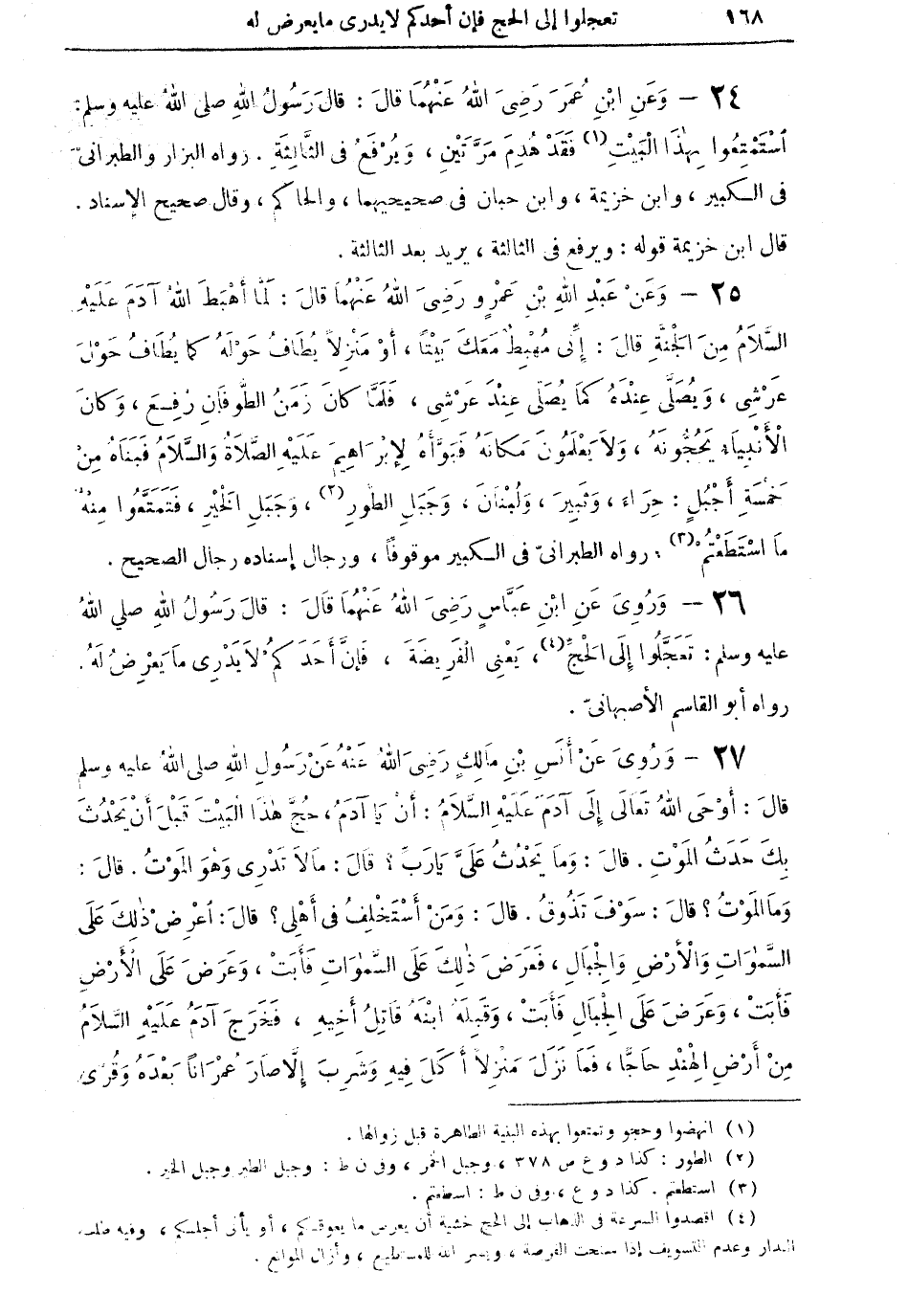27 - وروي عنْ أنس بن مالكٍ رضي الله عنه عنْ رسول الله صلى الله عليه وسلم قال: أوْحي الله تعالى آدم عليه السلام: أن يا آدم، حجَّ هذا البيت قبل أن يحدث بك حدث الموتِ. قال: وما يحدث عليَّ يا ربهَ؟ قال: مالا تدري وهو الموْت. قال: وما الموت؟ قال: سوف تذوق. قال: ومن أستخلفُ في أهلي؟ قال: اعرضْ ذلك على السَّموات والأرض والجبال، فعرض ذلك على السَّموات فأبت، وعرض على الأرض فأبتْ، وعرض على الجبالِ فأبت، وقبله ابنه قاتل أخيه، فخرج آدم عليه السلام: من أرض الهندِ حاجًّا، فما نزل منزلاً أكل فيه وشرب إلا صار عمراناً بعده وقرى