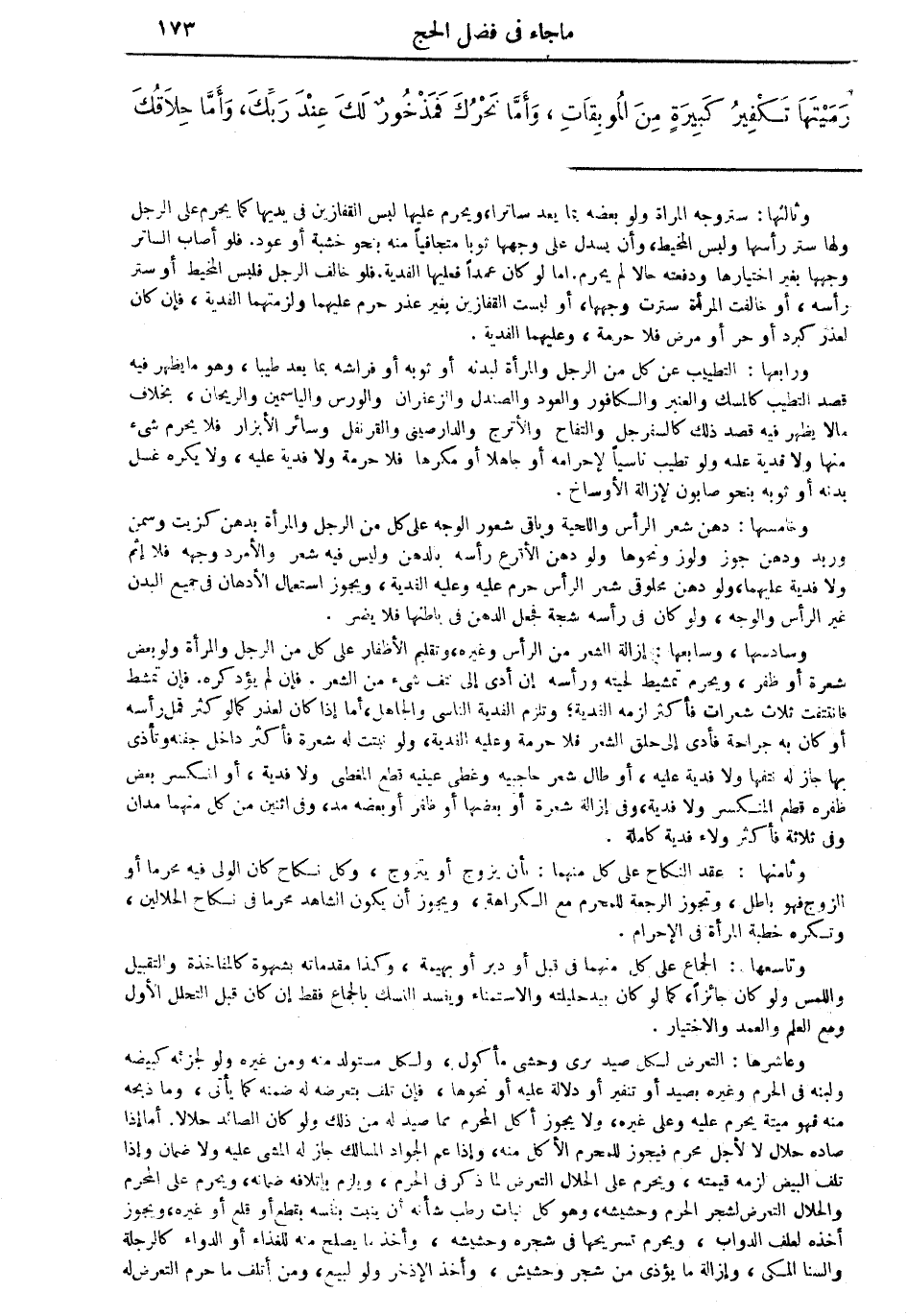 وسادسها، وسابعها: إزالة الشعر من الرأس وغيره، وتقليم الأظفار على كل من الرجل والمرأة ولو بعض شعرة أو ظفر، ويحرم تمشيط لحيته ورأسه إن أدى إلى نتف شيء من الشعر. فإن لم يؤد كره. فإن تمشط فانتتفت ثلاث شعرات فأكثر لزمه الفدية، وتلزم الفدية الناسي والجاهل، أما إذا كان لعذركما لو كثر قمل رأسه أو كان به جراحة فأدى إلى حلق الشعر فلا حرمة وعليه الفدية، ولو نبتت له شعرة فأكثر داخل جفنه وتأذى بها جاز له نتفها ولا فدية عليه، أو طال شعر حاجبيه وغطى عينيه قطع المغطي ولا فدية، أو انكسر بعض ظفره قطع المنكسر ولا فدية، وفي إزالة شعرة أو بعضها أو ظفراً وبعضه مد، وفي اثنين من كل منهما مدان، وفي ثلاثة فأكثر ولاء فدية كاملة.