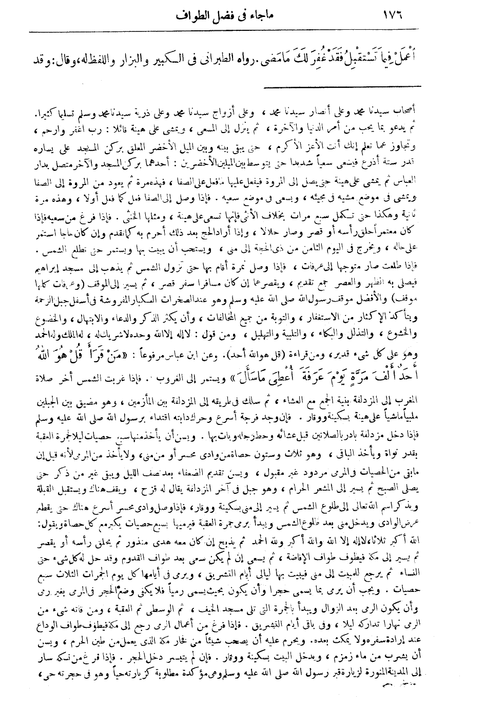 = أصحاب سيدنا محمد، وعلى أنصار سيدنا محمد، وعلى أزواج سيدنا محمد، وعلى ذرية سيدنا محمد، وسلم تسليماً كثيراً، ثم يدعو بما يحب من أمر الدنيا والآخرة، ثم ينزل إلى المسعى، ويمشي على هينة قائلا: رب اغفر وارحم، وتجاوز عما تعلم، إنك أنت الأعز الأكرم، حتى يبقى بينه وبين الميل الأخضر المعلق بركن المسجد على يساره قد ستة أذرع فيسعى سعياً شديداً حتى يتوسط بين الميلين الأخضرين: أحدهما بركن المسجد والآخر متصل بدار العباس، ثم يمشي على هينة حتى يصل إلى المرورة, فيفعل عليها ما فعل على الصفا، فهذه مرة، ثم يعود من المروة إلى الصفا ويمشي في موضع مشيه في مجيئه، ويسعى في موضع سعيه. فإذا وصل إلى الصفا فعل كما فعل أولا، وهذه مرة ثانية، وهكذا حتى تكمل سبع مرات بخلاف الأنثى فإنها تسعى على هينة، ومثلها الخنثى. فإذا فرغ من سعيه فإذا كان معتمراً حلق رأسه أو قصر، وصار حلالا، وإذا أراد الحج بعد ذلك أحرم به كما تقدم، وإن كان حاجا استمر على حاله، ويخرج في اليوم الثامن من ذي الحجة إلى منى، ويستحب أن يبيت بها ويستمر حتى تطلع الشمس. فإذا طلعت سار متوجها إلى عرفات، فإذا وصل نمرة أقام بها حتى تزول الشمس، ثم يذهب إلى مسجد إبراهيم فيصلي به الظهر والعصر جمع تقديم، ويقصرهما إن كان مسافرا سفر قصر، ثم يسير إلى الموقف (وعرفات كلها موقف) والأفصل موقف رسول الله صلى الله عليه وسلم، وهو عند الصخرات الكبار المفروشة في أسفل جبل الرحمة، ويتأكد الإكثار من الاستغفار، والتوبة من جميع المخالفات، وأن يكثر الذكر والدعاء والابتهال، والخضوع والخشوع، والتذلل والبكاء، والتلبية والتهليل، ومن قول: لا إله إلا الله وحده لا شريك له، له الملك وله الحمد وهو على كل شيء قدير، ومن قراءة قل هو الله أحد. وعن ابن عباس مرفوعاً: (من قرأ: قلْ هو الله أحد. ألف مرةٍ يوم عرفة أعطي ما سأل) ويستمر إلى الغروب. فإذا غربت الشمس أخر صلاة المغرب إلى المزدلفة بنية الجمع مع العشاء، ثم سلك في طريقه إلى المزدلفة بين المأزمين، وهو مضيق بين الجبلين ملبياً ماشياً على هينة بسكينة ووقار. فإن وجد فرجة أسرع وحرك دابته، اقتداء برسول الله صلى الله عليه وسلم، فإذا دخل مزدلفة بادر بالصلاتين قبل عشائه وحط رحلات وبات بها، ويسن أن يأخذ منها سبع حصيات ليلا لجمرة العقبة بقدر نواة، ويأخذ الباقي، وهو ثلاث وستون حصاة من وادي محسرة، أو من منى، ولا يأخذ من المرمى لأنه قيل إن ما بقي من الحصيات في المرمى مردود غير مقبول، ويسن تقديم الضعفاء بعد نصف الليل، ويبقى غير من ذكر حتى يصل الصبح ثم يسير إلى المشعر الحرام، وهو جبل في آخر المزدلفة، يقال له قرح، ويقف هناك ويستقبل القبلة ويذكر اسم الله تعالى إلى طلوع الشمس، ثم يسير إلى منى بسكينة ووقار، فإذا وصل وادي محسر أسرع هناك حتى يقطع عرض الوادي، ويدخل منى بعد طلوع الشمس، ويبدأ برمي جمرة العقبة فيرميها بسبع حصيات، يكبر مع كل حصاة ويقول: الله أكبر ثلاثا، لا إله إلا الله والله أكبر ولله الحمد، ثم يذبح إن كان معه هدي منذور، ثم يحلق رأسه أو يقصر، ثم يسير إلى مكة فيطوف طواف الإفاضة، ثم يسعى إن لم يكن سعي بعد طواف القدوم، وقد حل له كل شيء حتى النساء، ثم يرجع للمبيت إلى منى فيبيت بها ليالي التشريق، ويرمي في أيامها كل يوم الجمرات الثلاث سبع حصيات، ويجب أن يرمي بما يسمي حجراً، وأن يكون بحيث يسمى رمياً، فلا يكفي وضع الحجر في المرمى بغير رمي، وأن يكون الرمي بعد الزوال، ويبدأ بالجمرة التي تلي مسجد الخيف، ثم الوسطى، ثم العقبة، ومن فاته شيء من الرمي نهاراً تداركه ليلا، وفي باقي أيام التشريق. فإذا فرغ من أعمال الرمي رجع إلى مكة فيطوف طوال الوداع عند إرادة سفره ولا يمكث بعده، ويحرم عليه أن يصحب شيئاً من فخار مكة الذي يعمل من طين الحرم، ويسن أن يشرب من ماء زمزم، ويدخل البيت بسكينة ووقار. فإن لم يتيسر دخل الحجر. فإذا فرغ من نسكه سار إلى المدينة المنورة لزيارة قبر رسول الله صلى الله عليه وسلم، وهي مؤكدة مطلوبة كزيارته حياً، وهو في حجرته حي، =