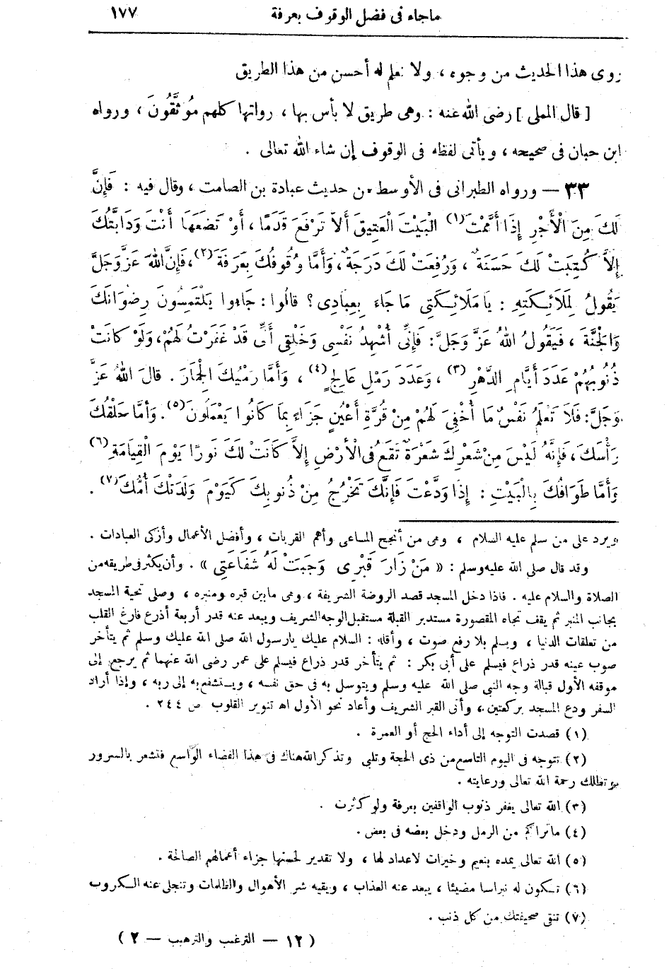 33 - ورواه الطبراني في الأوسط من حديث عبادة بن الصامت، وقال فيه: فإن لك من الأجر إذا أمَّمت (¬1) البيتَ العتيق ألا ترفع قدماً، أو تضعها أنت ودابَّتك إلا كتبتْ لك حسنة، ورفعتْ لك درجة، وأمَّا وقوفك بعرفة (¬2)، فإنَّ الله عزَّ وجلَّ يقول لملائكته: يا ملائكتي ما جاء بعبادي؟ قالوا: جاءوا يلتمسون رضوانك والجنَّة، فيقول الله عزَّ وجلَّ: فإني أشهد نفسي وخلقي أني قد غفرتْ لهمْ، ولوْ كانتْ ذنوبهمْ عدد أيَّام الدَّهر (¬3)، وعدد رمل عالجٍ (¬4) , وأمَّا رميك الجمار. قال الله عزَّ وجلَّ: فلا تعْلم نفس ما أخفى لهمْ من قرَّة أعينٍ جزاءً بما كانوا يعملون (¬5). وأمَّا حلقك رأسك، فإنَّه ليس من شعرك شعرة تقع في الأرض إلا كانت لك نوراً يوم القيامة (¬6) وأمَّا طوافك بالبيتِ: إذا ودَّعت فإنَّك تخرجُ من ذنوبك كيومَ ولدتك أمُّك (¬7).