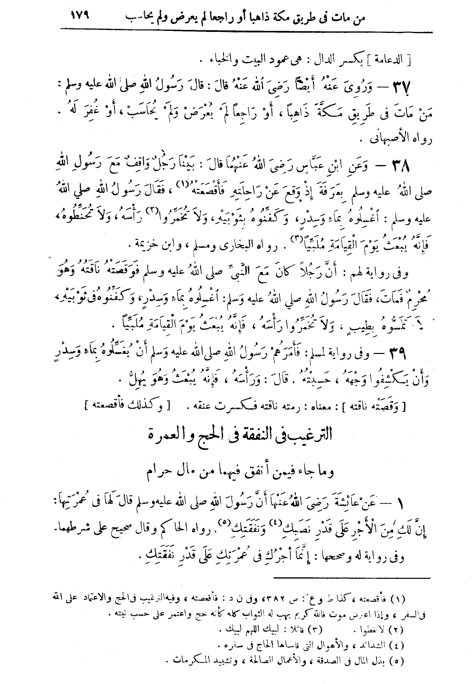 39 - وفي رواية لمسلم: فأمرهمْ رسول الله صلى الله عليه وسلم: أنْ يُغَسِّلوهُ بماء وسدرٍ، وأنْ يكشفوا وجههُ، حسبتهُ. قال: ورأسه، فإنَّه يبعث وهو يهلُّ.