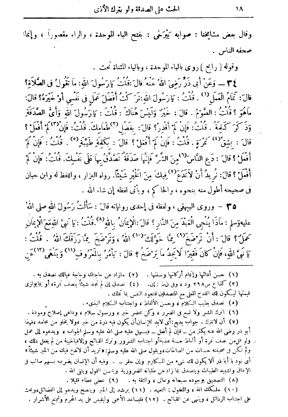34 - وعن أبي ذرٍ رضي الله عنه قال: قلتُ: يا رسول الله: ما تقول في الصَّلاة؟ قال: تمام العمل (¬1). قلتُ: يا رسول الله: تركتُ أفضل عملٍ في نفسي أوْ خيره؟ قال: ما هو؟ قلتُ: الصَّوم؟ قال: خير وليس هناك. قُلت يا رسول الله: أي الصَّدقة وذكر كلمة. قلت: فإن لم أقدر؟ قال: بفضل (¬2) طعامك. قلت: فإن (¬3) أفعل؟ قال: بشقِّ (¬4) تمرةٍ. قلت: فإن لم أفعل؟ قال: بكلمة طيبةٍ (¬5). قلت: فإن لم أفعل؟ قال: دع الناس (¬6) من الشِّرِّ، فإنَّها صدقة تصَّدق بها على نفسك. قلت: فإن لم أفعل؟ قال: تريد أن لا تدع (¬7) فيك من الخير شيئاً. رواه البزار، واللفظ له وابن حبان في صحيحه أطول منه بنحوه، والحاكم، ويأتي لفظه إن شاء الله.