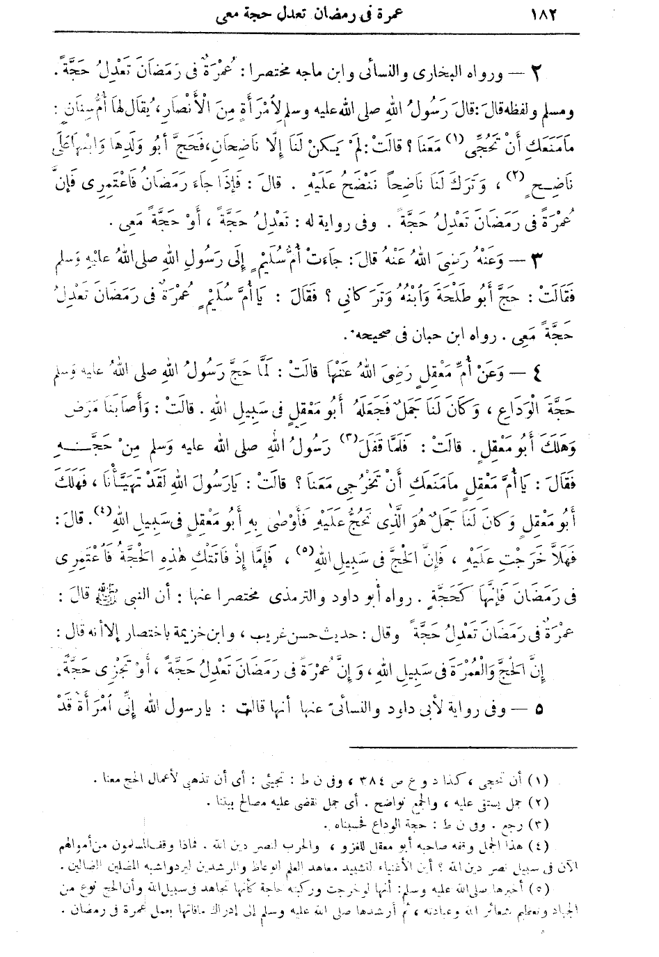 3 - وعنه رضي الله عنه قال: جاءت أمُّ سليمٍ إلى رسول الله صلى الله عليه وسلم فقالت: حجَّ أبو طلحة وابنه وتركاني؟ فقال: يا أمَّ سليم عمرة في رمضان تعدل حجَّة معي. رواه ابن حبان في صحيحه.